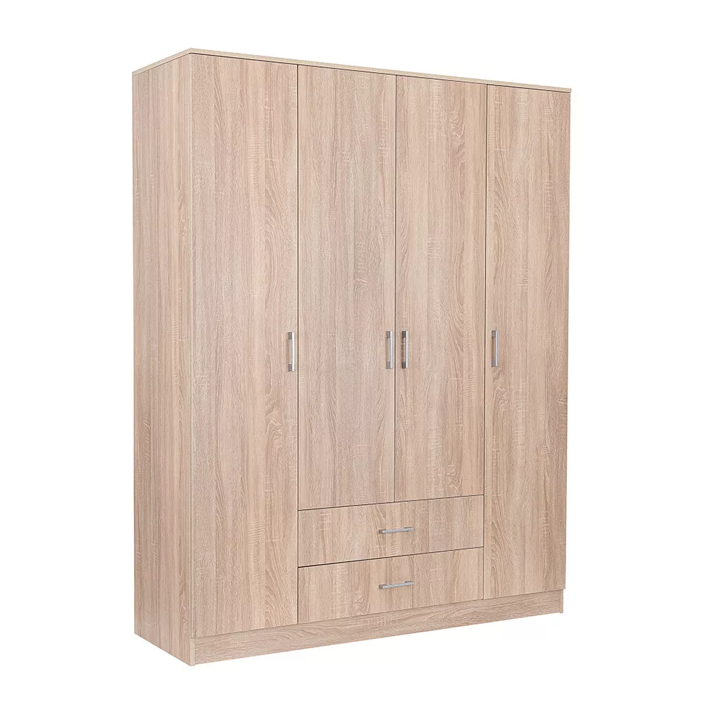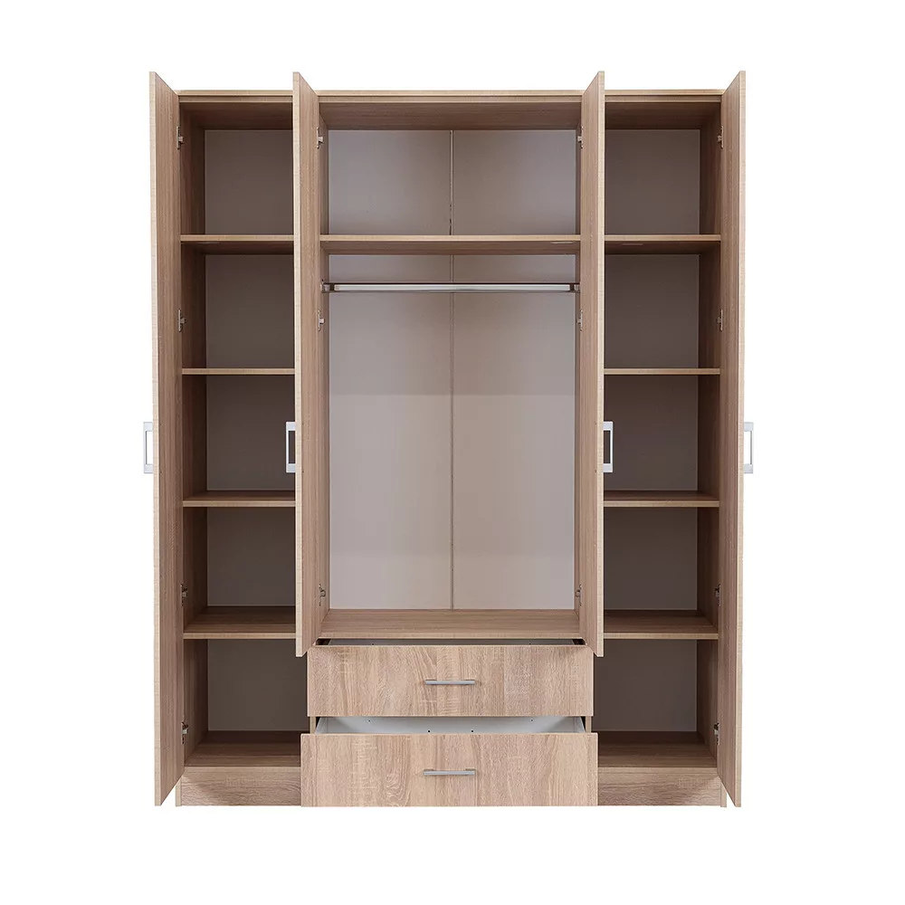 Plastikowe uchwyty z efektem matowego chromu nadają jej nowoczesny wygląd, adwuskrzydłowe drzwi i półki sprawiają, że całe wnętrze szafy jest dobrze widoczne, dzięki czemu wszystkie ubrania i rzeczy są w zasięgu ręki. 11 półek idwie szuflady na kółkach zapewniają dużo miejsca do przechowywania bielizny i odzieży poza sezonem.