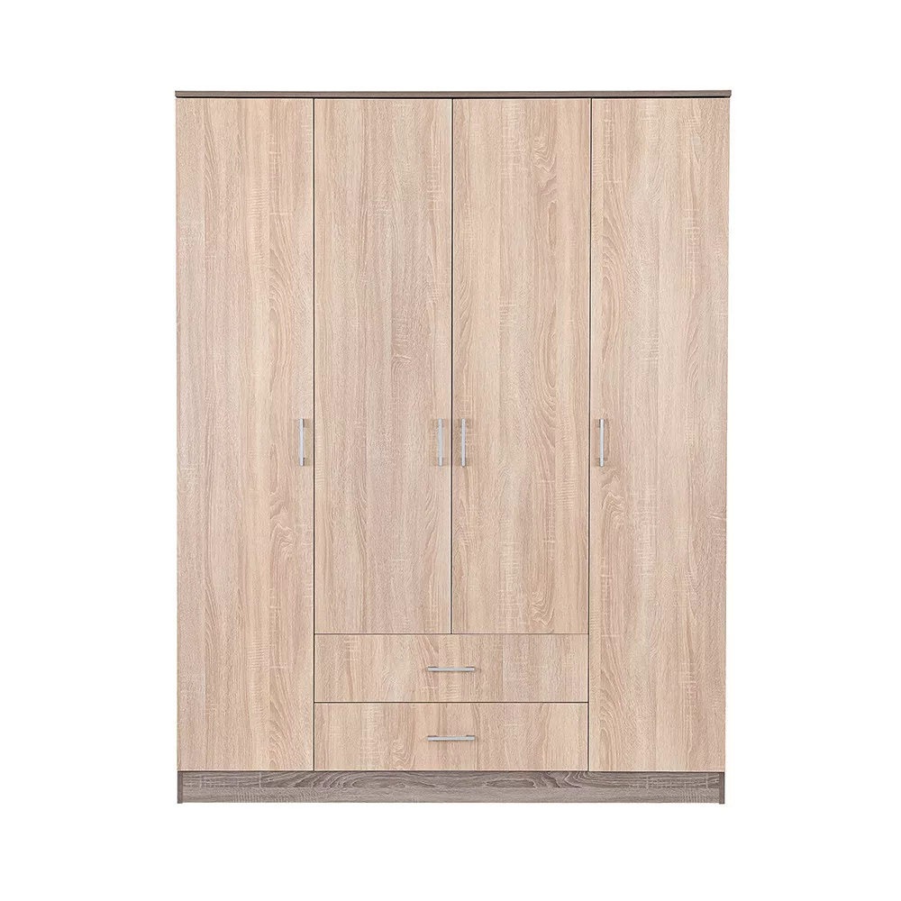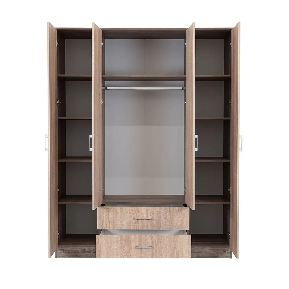 Plastikowe uchwyty z efektem matowego chromu nadają jej nowoczesny wygląd, adwuskrzydłowe drzwi i półki sprawiają, że całe wnętrze szafy jest dobrze widoczne, dzięki czemu wszystkie ubrania i rzeczy są w zasięgu ręki. 11 półek idwie szuflady na kółkach zapewniają dużo miejsca do przechowywania bielizny i odzieży poza sezonem.