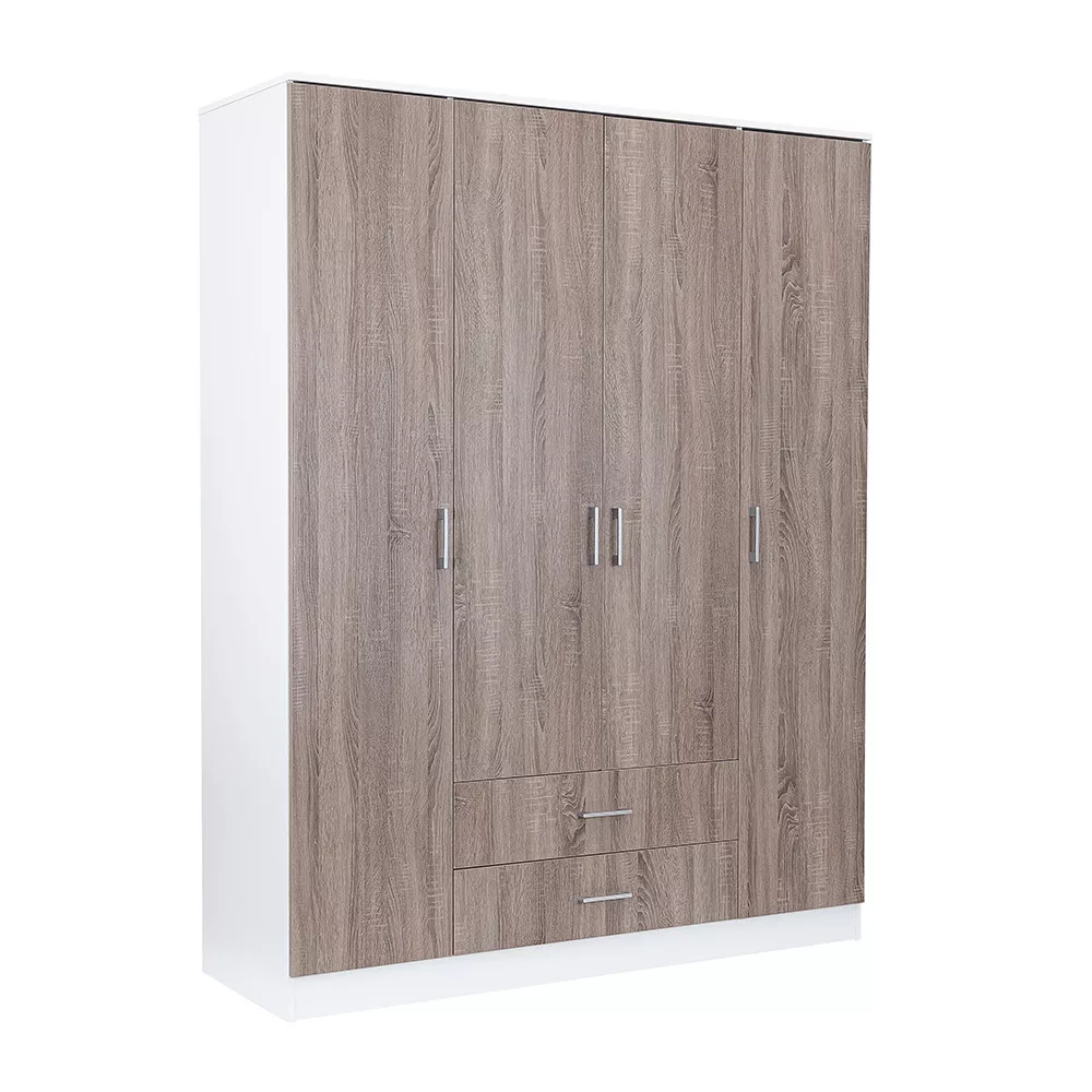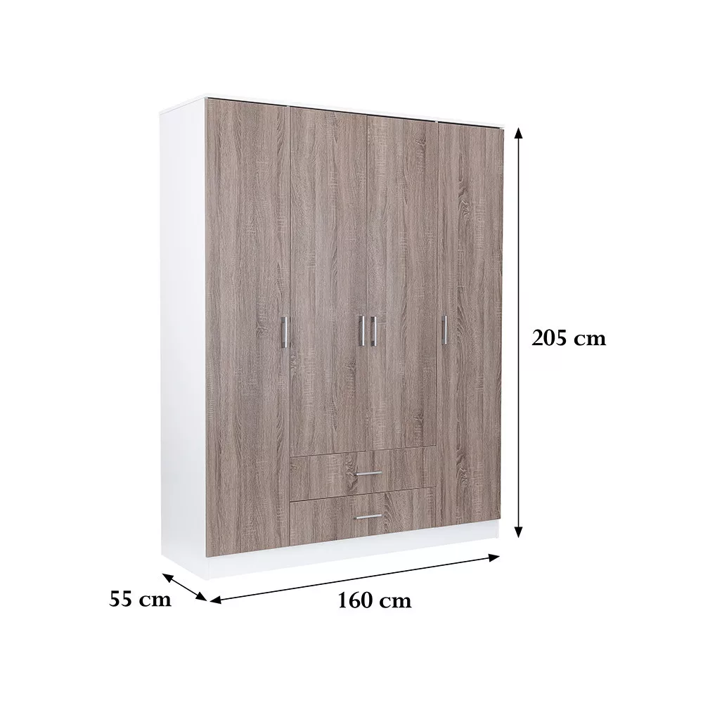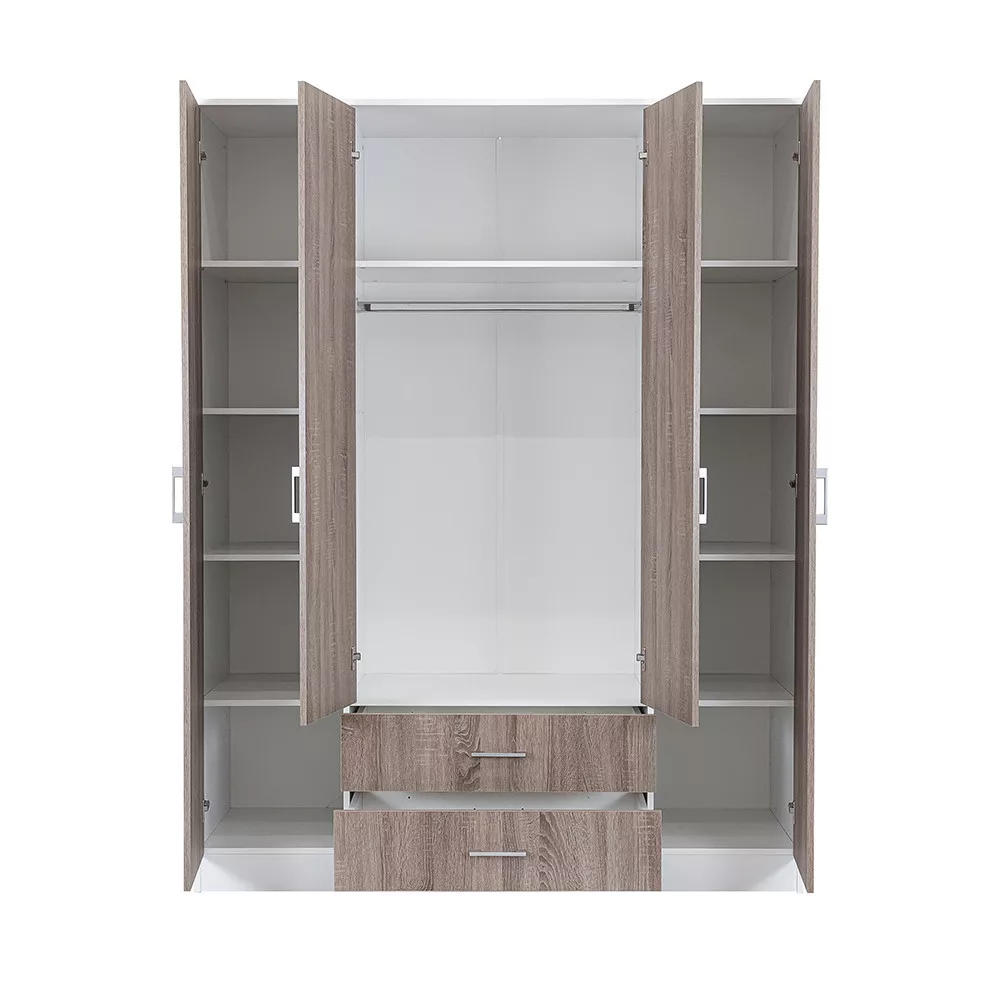 Plastikowe uchwyty z efektem matowego chromu nadają jej nowoczesny wygląd, adwuskrzydłowe drzwi i półki sprawiają, że całe wnętrze szafy jest dobrze widoczne, dzięki czemu wszystkie ubrania i rzeczy są w zasięgu ręki. 11 półek idwie szuflady na kółkach zapewniają dużo miejsca do przechowywania bielizny i odzieży poza sezonem.