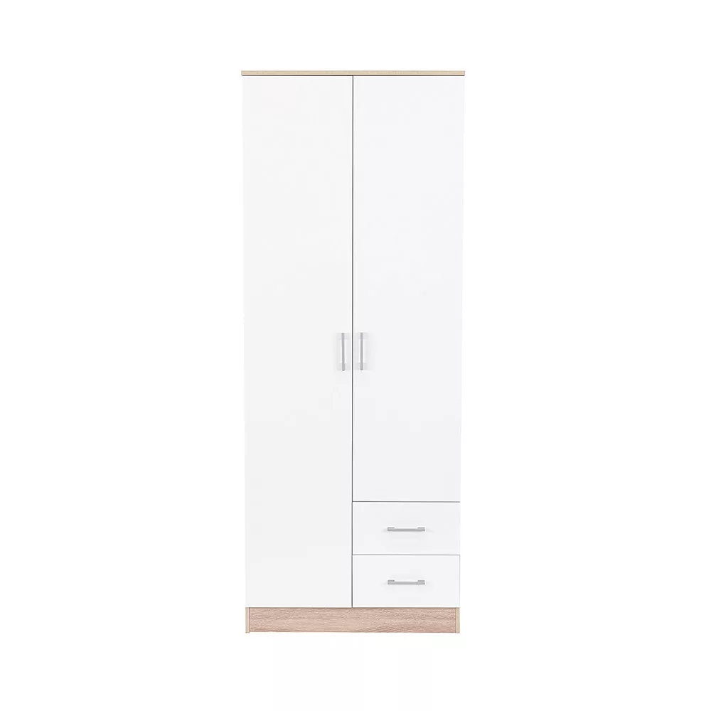 Matowe uchwyty z tworzywa sztucznego z efektem chromu nadają jej nowoczesny wygląd, a dwoje drzwi na zawiasach sprawia, że całe wnętrze szafy jest dobrze widoczne, dzięki czemu wszystkie ubrania i przedmioty są w zasięgu ręki. Pięć półek i dwie szuflady na kółkach zapewniają dużo miejsca do przechowywania bielizny i odzieży poza sezonem.