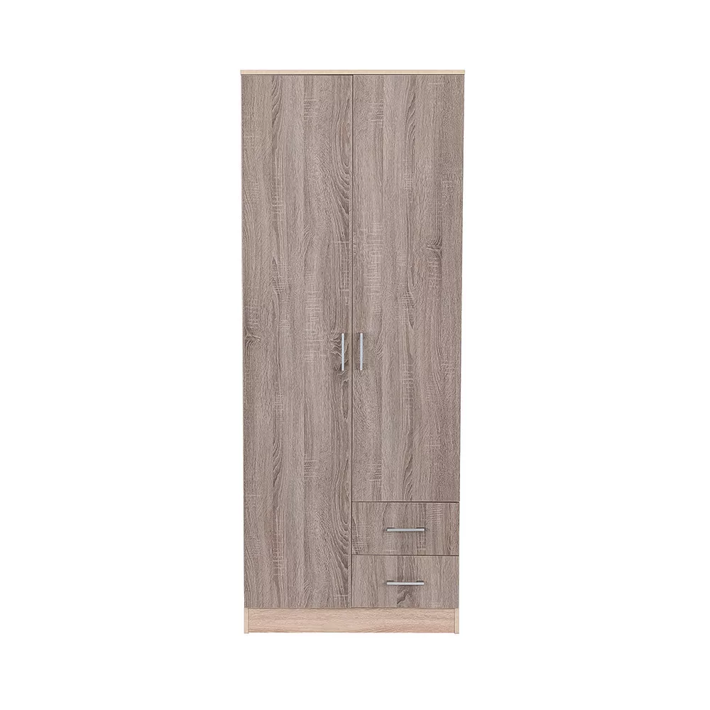Matowe uchwyty z tworzywa sztucznego z efektem chromu nadają jej nowoczesny wygląd, a dwoje drzwi na zawiasach sprawia, że całe wnętrze szafy jest dobrze widoczne, dzięki czemu wszystkie ubrania i przedmioty są w zasięgu ręki. Pięć półek i dwie szuflady na kółkach zapewniają dużo miejsca do przechowywania bielizny, odzieży poza sezonem lub pościeli z dębu York.
