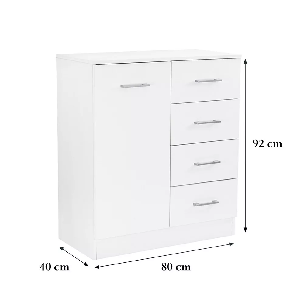 Dzięki białemu frontowi i korpusowi w kolorze dąb sonoma, kredens Miami dodaje przestrzeni czystości i elegancji, a wysokiej jakości materiał płyty meblowej gwarantuje trwałość i wytrzymałość. Jego wymiary - 40 cm głębokości, 80 cm szerokości i 92 cm wysokości - są idealne do każdego pomieszczenia. Komoda Komoda posiada3 półki za 1 otwieranymi drzwiczkami, a także 4 dodatkowe szuflady na kółkach, idealne do przechowywania ubrań, książek, a nawet artykułów biurowych. Nowoczesny design uzupełniają plastikowe uchwyty z efektem matowego chromu, które nadają jej jeszcze bardziej opływowy wygląd.