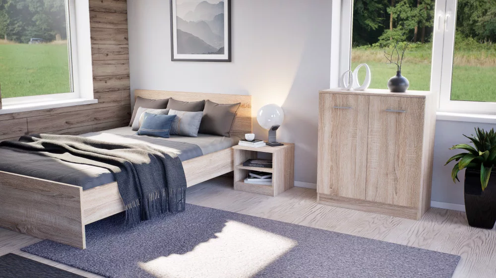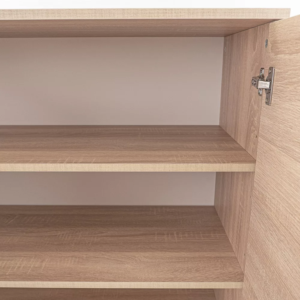 A Miami komód sonoma tölgy fronttal és a sonoma tölgy korpusszal letisztultságot és eleganciát kölcsönöz a térnek, miközben a minőségi bútorlap anyaga garantálja a tartósságot és az ellenálló képességet. Méretei - 40 cm mélység, 80 cm szélesség, 92 cm magasság - ideálisak bármely helyiségbe. A komód két szárnyú nyílóajtaja mögött 3 polc található, amelyek tökéletesen alkalmasak ruhák, könyvek vagy akár irodai felszerelések tárolására. A modern dizájnt matt króm hatású műanyag fogantyúk egészítik ki, amelyek még letisztultabbá teszik a megjelenést.