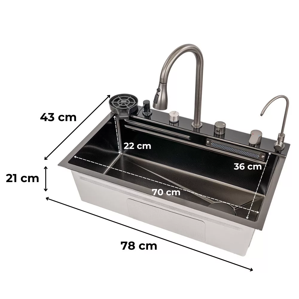 Wielofunkcyjny zlewozmywak Calandria ze stali nierdzewnej został zaprojektowany z myślą o potrzebach nowoczesnych kuchni. Jego wymiary 78x43x22 cm czynią go idealnym wyborem zarówno do małych, jak i dużych kuchni. Jego powierzchnia ze stali nierdzewnej 304 z nanopowłoką o grubości 3 mm jest nie tylko odporna na zarysowania i osadzanie się kamienia, ale także zapewnia doskonały wygląd.