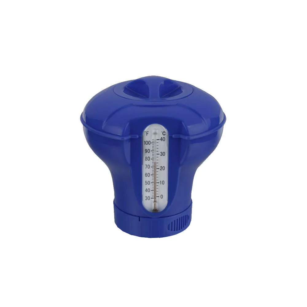 Pływający dozownik chemii basenowej z termometrem to praktyczne rozwiązanie do dozowania 200 g tabletek chemicznych. Dzięki pływającej konstrukcji urządzenie może unosić się na powierzchni wody, a wbudowany term ometr pomaga kontrolować temperaturę wody w basenie. Łatwe w użyciu narzędzie do codziennej konserwacji basenu.