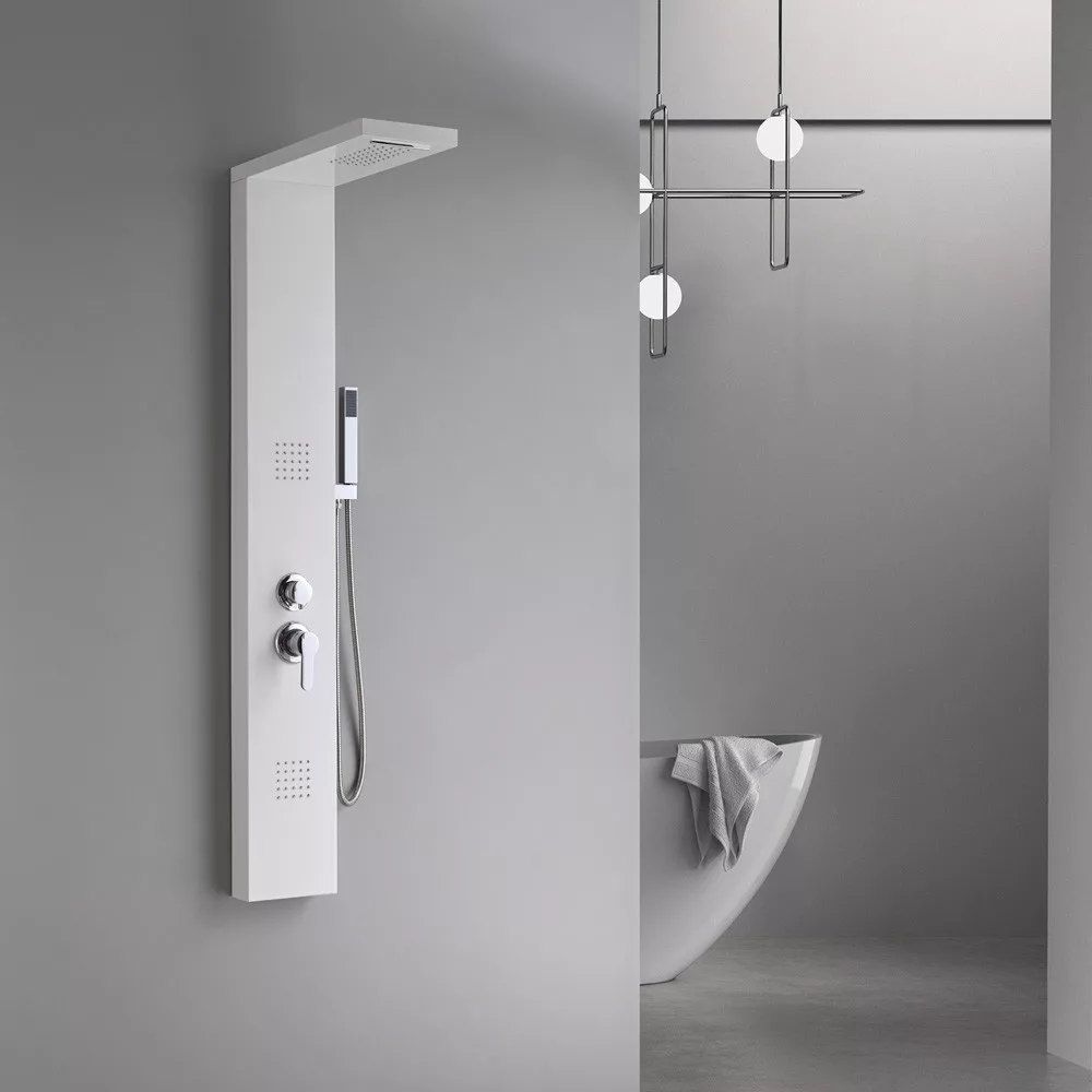 Panel prysznicowy z hydromasażem jest ulepszoną wersją panelu prysznicowego, uzupełnioną o wbudowane dysze masujące. Strumienie wody są skierowane na okolice pleców, talii lub ramion, zapewniając odświeżające i relaksujące doznania podczas kąpieli. Większość modeli jest wyposażona w termostatyczną baterię i wymaga silniejszego ciśnienia wody do prawidłowego działania.