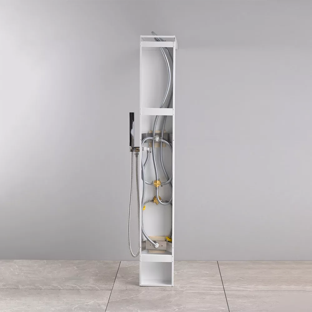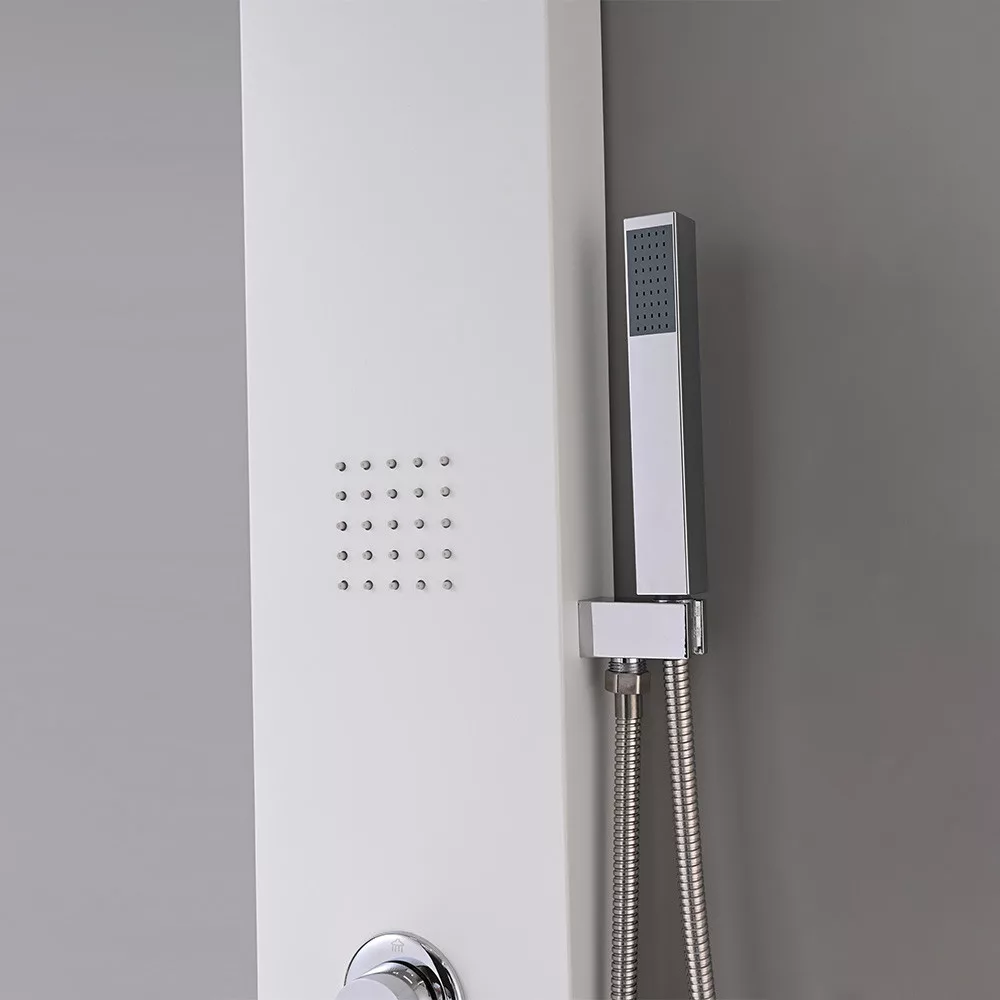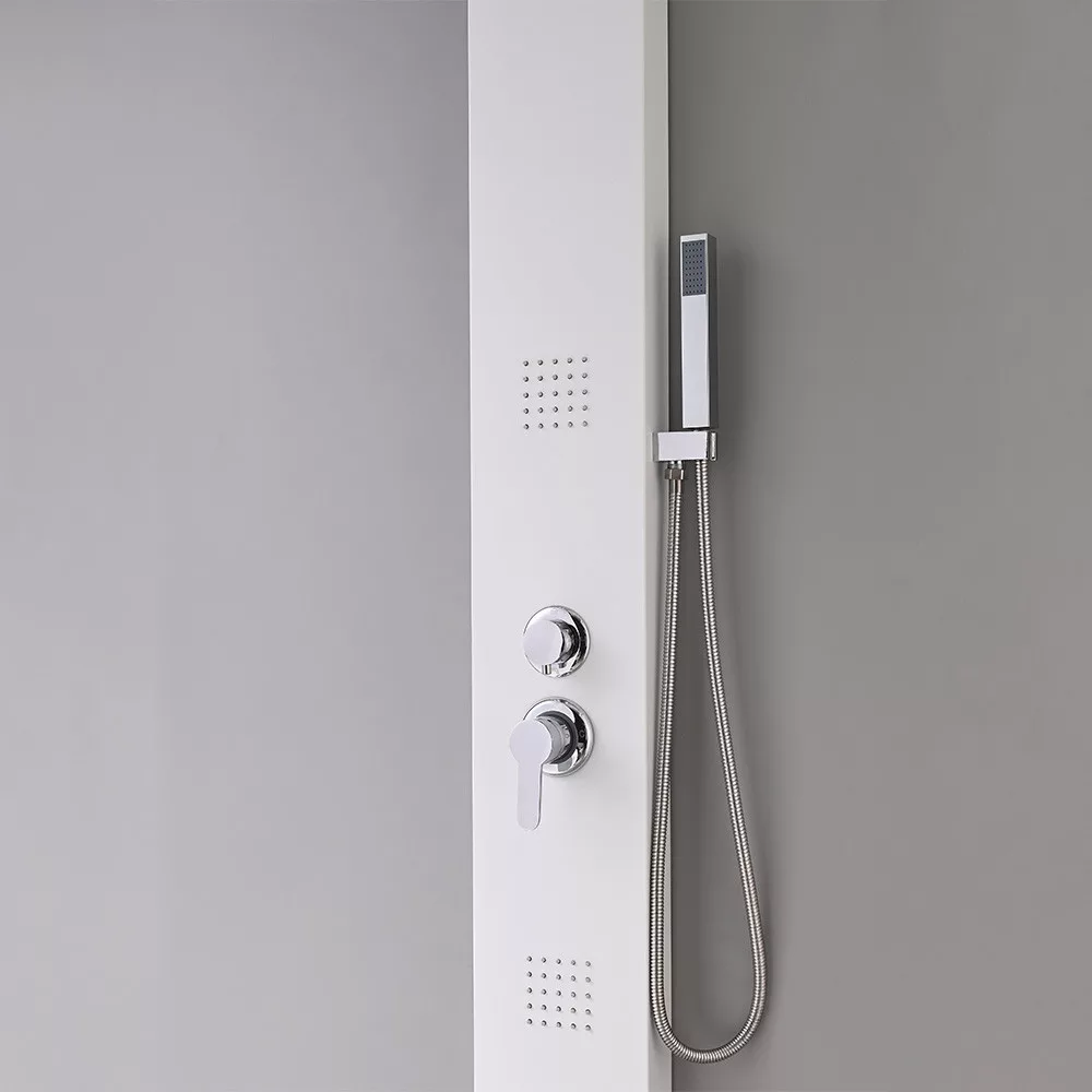 Panel prysznicowy jest również wyposażony w ręczny prysznic, który pozwala kierować ukierunkowane strumienie wody i dokładnie oczyścić dowolną część ciała. Elastyczny wąż prysznicowy ze stali nierdzewnej ma długość 1,5 m, zapewniając dużą swobodę ruchów podczas kąpieli. To trwałe i wygodne akcesorium prysznicowe ułatwia kąpiel i czyszczenie. Panel prysznicowy z hydromasażem Malaga White ma mosiężną wkładkę z zaworem przełączającym i chromowaną dźwignią, która umożliwia regulację ciśnienia i temperatury wody.