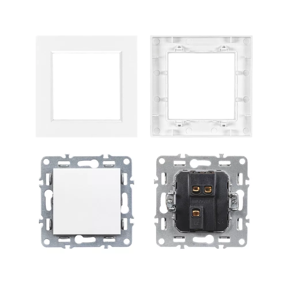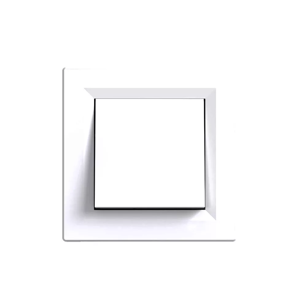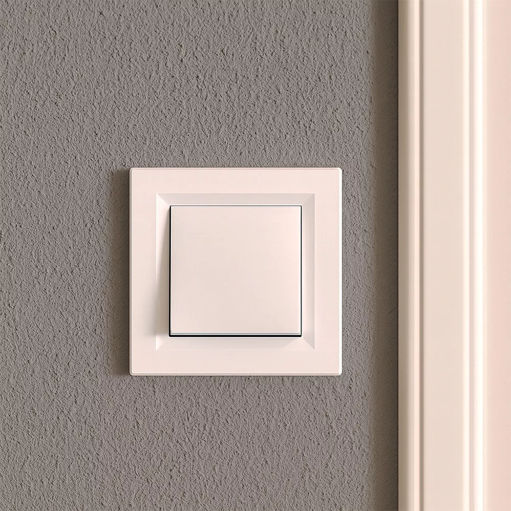 Ten model jest dostarczany z fabrycznie zainstalowaną białą ramką Nova One, nadającą przełącznikowi jednolity, uporządkowany wygląd natychmiast po instalacji. Zaokrąglone krawędzie i kompaktowy rozmiar 83 × 83 mm nadają mu nowoczesny, czysty styl, który harmonizuje z większością wnętrz.