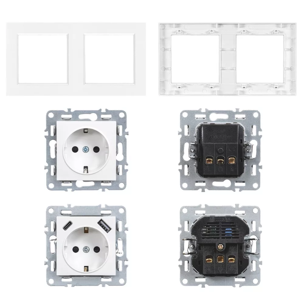 Dwa oddzielne moduły (gniazdo z uziemieniem i gniazdo USB) są fabrycznie wbud owane w białą poziomą ramkę Nova 2, nadając oprawie kompletny, czysty wygląd po zainstalowaniu. Zaokrąglony kształt i wpuszczana konstrukcja oferują wizualnie dyskretne, eleganckie rozwiązanie do nowoczesnych wnętrz.