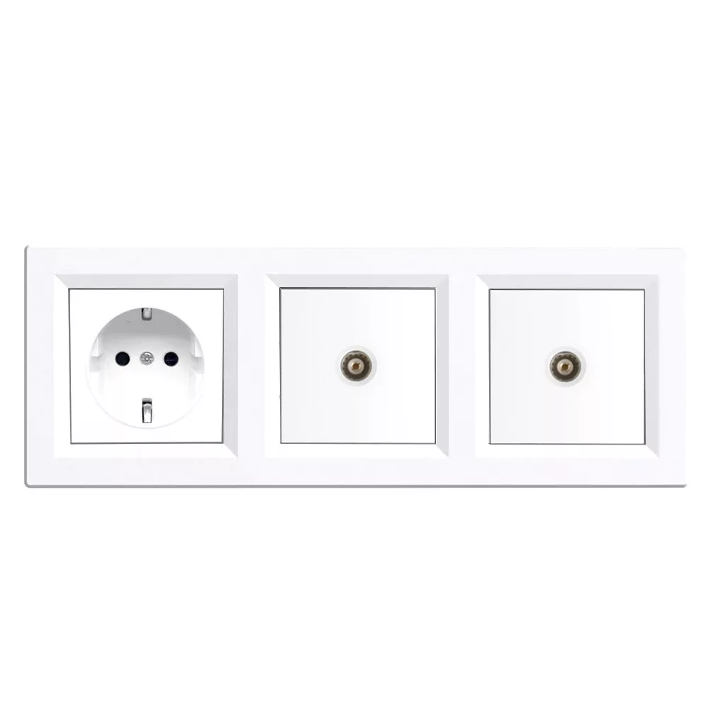 A Nova III földelt csatlakozóaljzat kettő TV csatlakozóval ideális választás, ha egyetlen szerelvényben szeretnéd megoldani az elektromos áramellátást és a televíziós jelcsatlakoztatást. A földelt aljzat 16 A névleges áramerősséggel és 250 V AC feszültségre készült, a két koaxiális RF aljzat pedig stabil és megbízható jelátvitelt biztosít, ezáltal kiváló kép- és hangminőséget érhetsz el.A termék süllyesztett kivitelű, csavaros rögzítéssel szerelhető szabványos szerelvénydobozba. Keret nélküli moduláris kialakítása lehetővé teszi, hogy többes keretbe illeszd, így harmonikusan illeszkedik más Nova szerelvények közé. IP20-as védettsége miatt kizárólag száraz, pormentes, beltéri környezetben (pl. nappali, hálószoba, iroda) alkalmazható. A villamos csatlakoztatást minden esetben érvényes szakképesítéssel rendelkező villanyszerelőnek kell végeznie a hatályos előírások szerint.