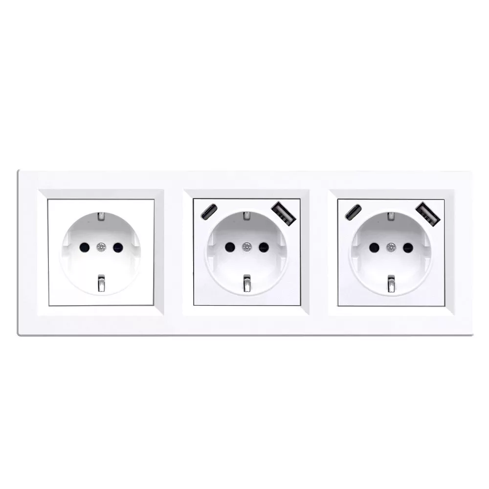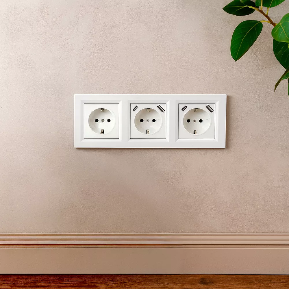Gniazdo sieciowe z uziemieniem Nova III z dwoma złączami USB to praktyczne i nowoczesne rozwiązanie, które łączy w sobie wygodę tradycyjnego zasilania sieciowego 230 V z wygodą bezpośredniego ładowania USB. Gniazdo z uziemieniem działa przy prądzie znamionowym 16 A i 250 V AC, podczas gdy porty USB-A i USB-C zapewniają łączny prąd ładowania do 2 A, idealny do ładowania urządzeń o niższym poborze mocy, takich jak telefony komórkowe, smartwatche lub słuchawki, bez konieczności stosowania oddzielnego adaptera. Wpuszczane, przykręcane gniazdo pasuje do standardowej puszki montażowej, a dołączona biała ramka zapewnia estetyczny wygląd i spójny styl z resztą serii opraw Nova. Stopień ochrony IP20 oznacza, że można go używać wyłącznie w suchych, bezpyłowych pomieszczeniach, takich jak salony, sypialnie lub biura. Połączenia elektryczne powinny być zawsze wykonywane przez wykwalifikowanego elektryka zgodnie z obowiązującymi normami.