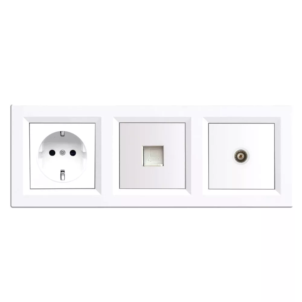 Potrójny zestaw gniazd Nova - gniazdo z uziemieniem, gniazdo UTP i gniazdo TV w jednym, z czystą białą ramką