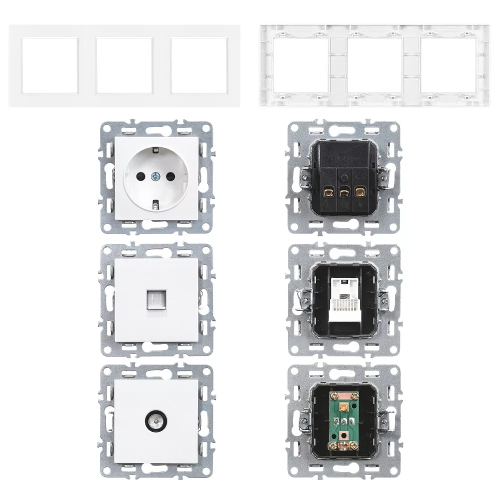 Ten zestaw osprzętu Nova to idealne rozwiązanie dla tych, którzy cenią sobie funkcjonalność, estetykę i jednolity wygląd. Potrójna konstrukcja obejmuje uziemione gniazdo 230 V, gniazdo RJ-45 UTP i koncentryczne gniazdo TV - wszystko w jednej, czystej, białej ramce. Poziomy układ modułów jest praktyczny i łatwy do zauważenia.