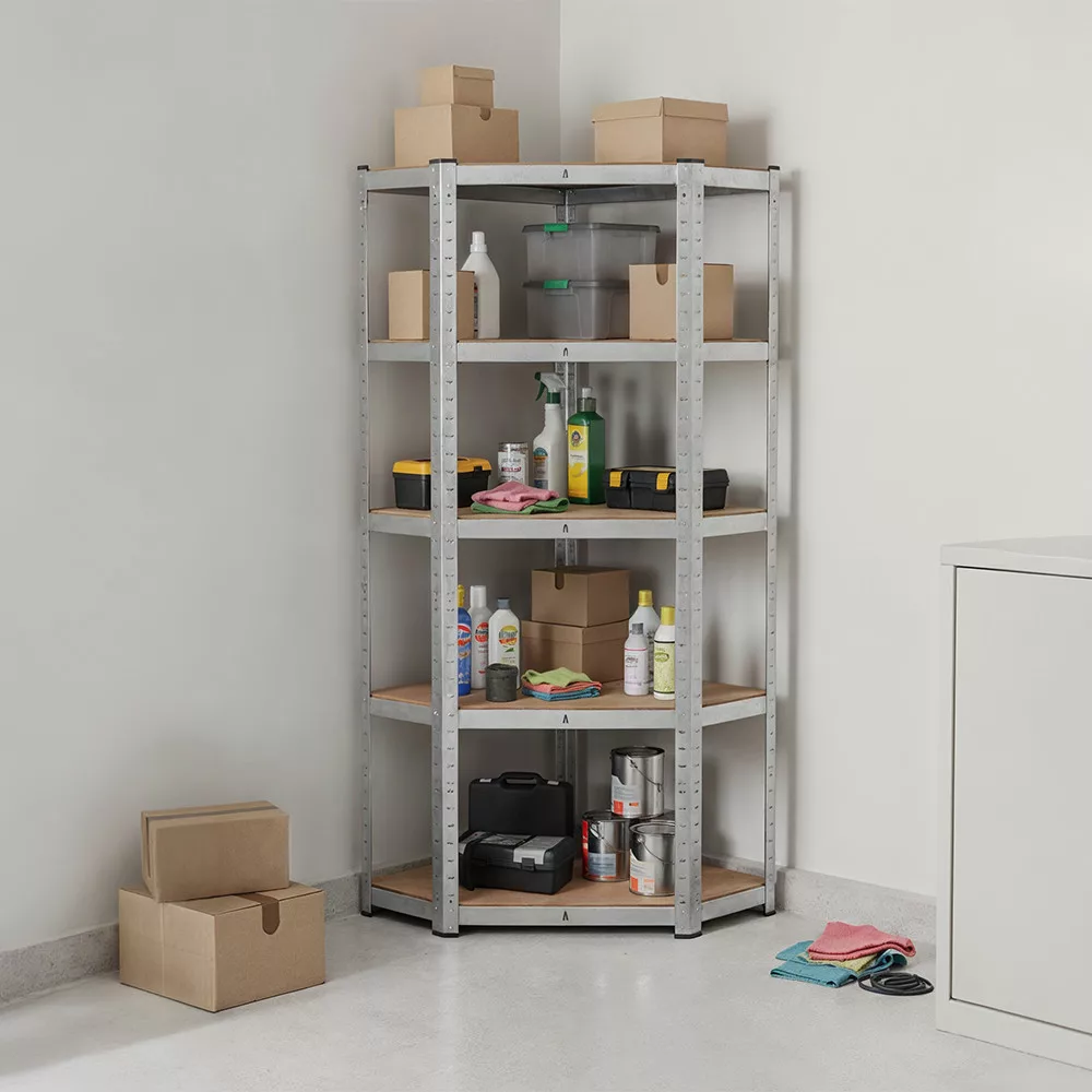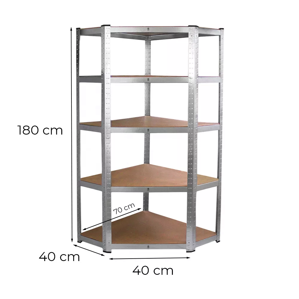 Wytrzymały regał narożny 180x70x40-40 cm to idealny wybór, jeśli chcesz maksymalnie wykorzystać każdy metr kwadratowy. System regałów z 5 półkami z chromowanego metalu jest idealny do garaży, magazynów lub warsztatów, w których ważna jest stabilność i duża nośność. Jedna półka może utrzymać 175 kg, dzięki czemu cały system regałów może bezpiecznie utrzymać do 875 kg.