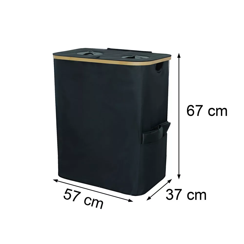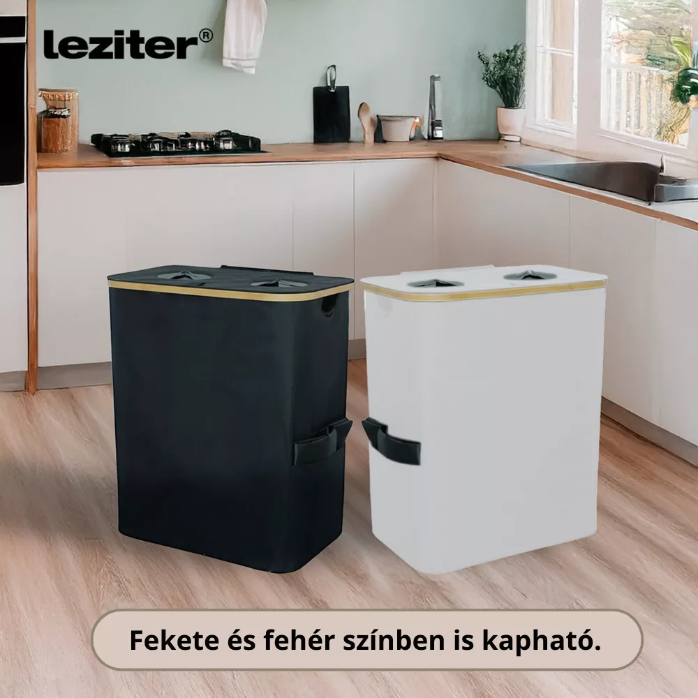 Dwukomorowy kosz na butelki Leziter o pojemności 140 litrów ma 67 cm wysokości, 57 cm szerokości i 37 cm głębokości, dzięki czemu nie tylko oferuje dużą pojemność, ale także zajmuje niewiele miejsca. Dzięki swojemu kształtowi można go łatwo umieścić w kuchni, biurze lub garażu.