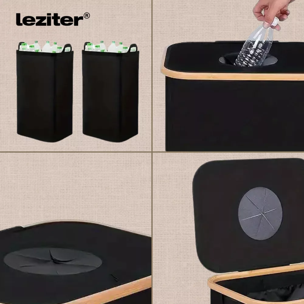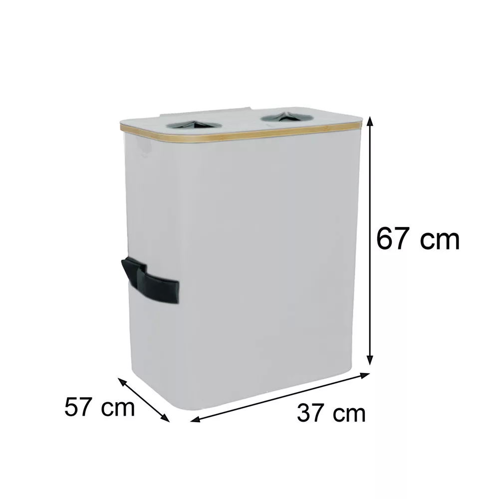 Dwukomorowy kosz na butelki Leziter o pojemności 140 litrów ma 67 cm wysokości, 57 cm szerokości i 37 cm głębokości, dzięki czemu nie tylko oferuje dużą pojemność, ale także zajmuje niewiele miejsca. Dzięki swojemu kształtowi można go łatwo umieścić w kuchni, biurze lub garażu.