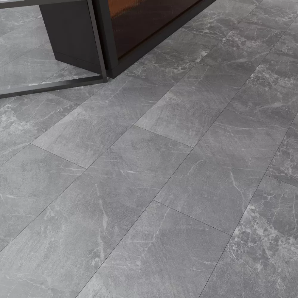 Ciemnoszara podłoga Fjord o marmurowym wzorze zapewnia charakterystyczny, nowoczesny i naturalny efekt kamienia. Jej głębokie, ciemne odcienie tworzą elegancką, ekskluzywną atmosferę, co czyni ją idealnym wyborem do nowoczesnych domów, biur lub sklepów.