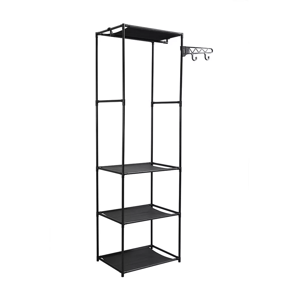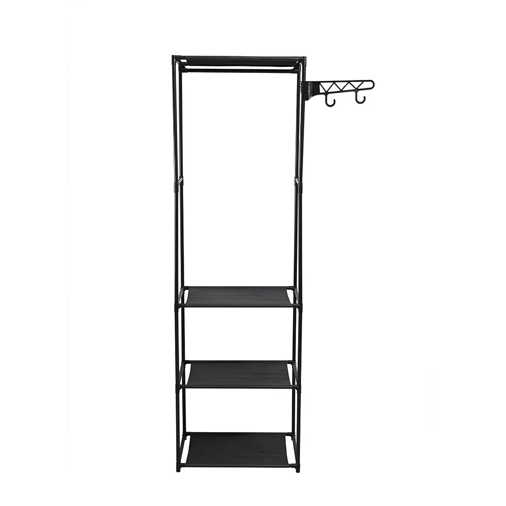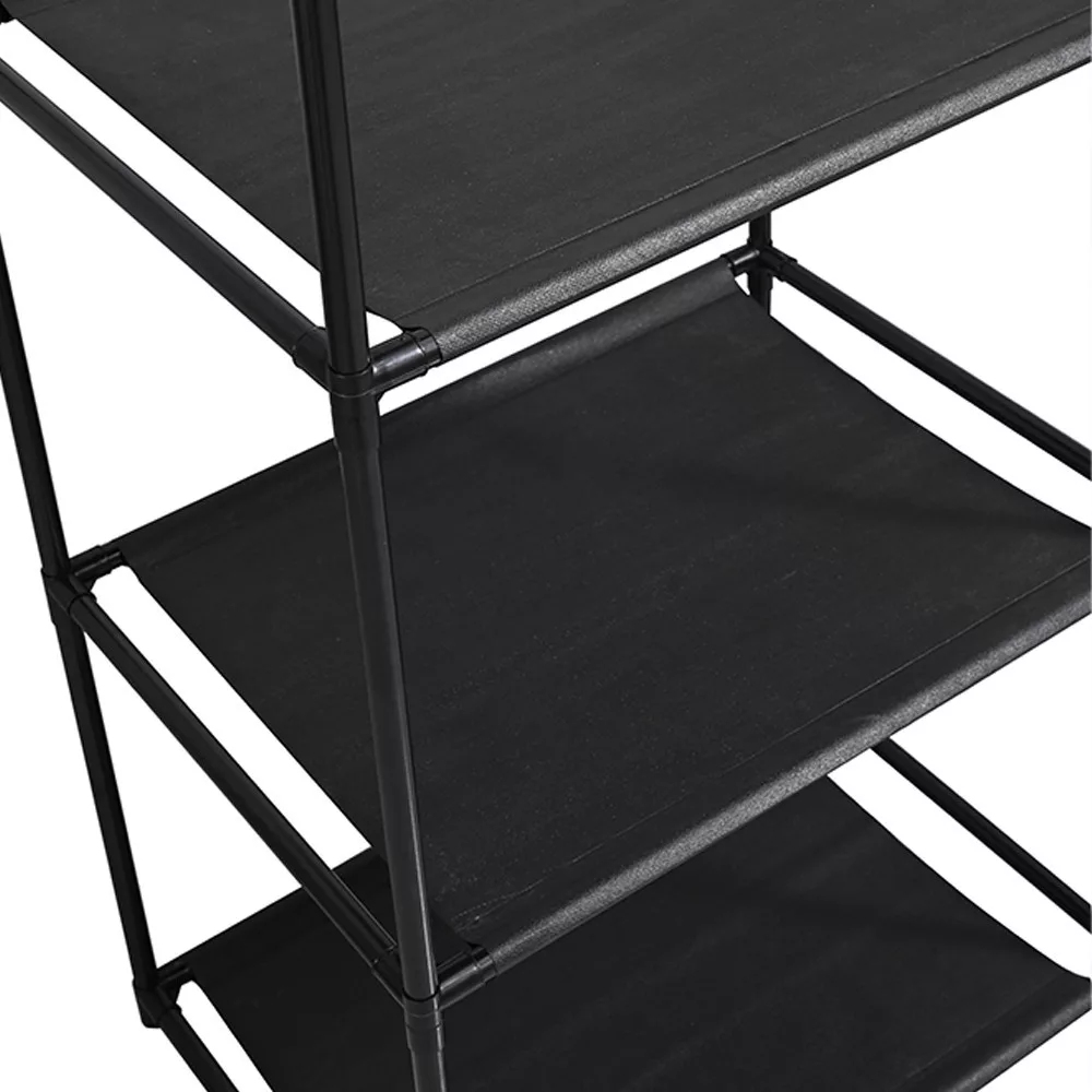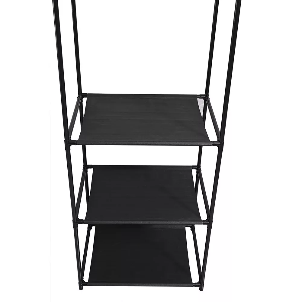 Ten wieszak na ubrania jest wykonany z wytrzymałej metalowej ramy, która zapewnia stabilność i trwałość, której potrzebujesz. Półki wykonane są z materiału tekstylnego, wzmocnionego warstwą tworzywa sztucznego, oferując praktyczne rozwiązanie do organizowania i przechowywania ubrań. Czysty czarny kolor emanuje elegancją i może być używany jako świetny element dekoracyjny w każdym pomieszczeniu.