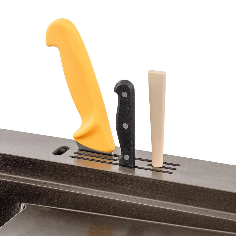 Powierzchnia ociekacza zlewozmywaka Dahlia umożliwia szybkie suszenie naczyń, a wbudowany odpływ ułatwia czyszczenie. Innowacyjny system ociekacza na noże pomaga bezpiecznie przechowywać noże i inne przybory kuchenne, dzięki czemu są one zawsze pod ręką, gdy są potrzebne.