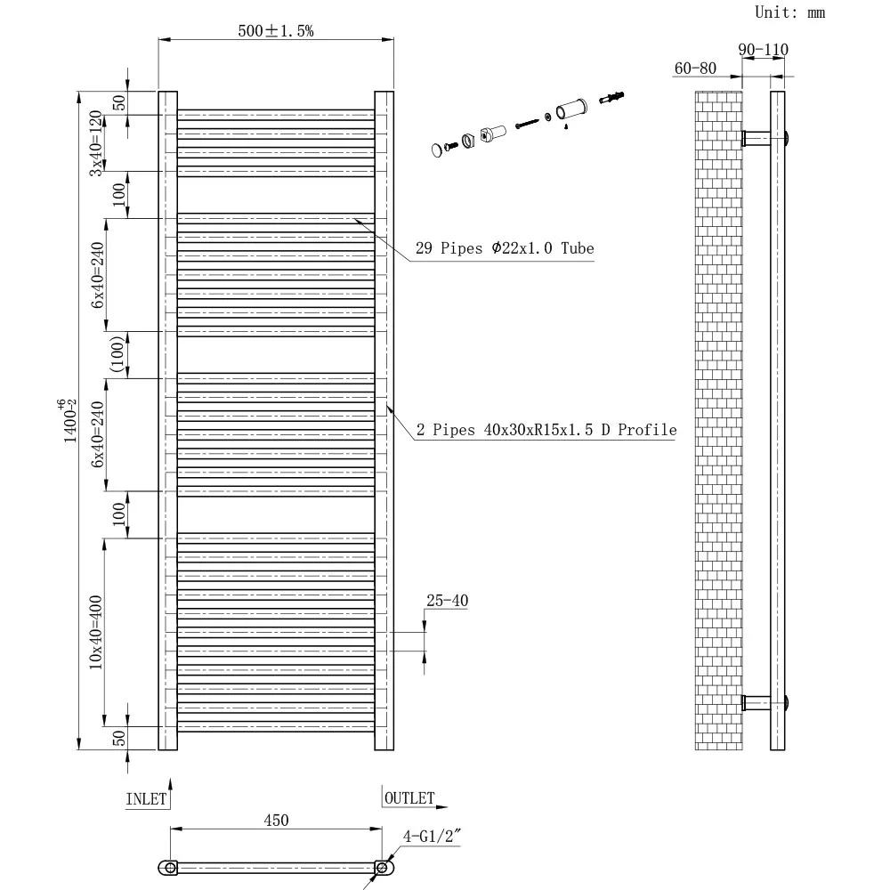 Wymiary 1400x500 mm zapewniają dużą powierzchnię suszenia, a kompaktowa konstrukcja pozwala zaoszczędzić miejsce. Proste rurki są czysto zaprojektowane, dzięki czemu ręczniki można łatwo zakładać i zdejmować. Przemyślany kształt nie tylko zwiększa wydajność, ale także sprawia, że czyszczenie i konserwacja są niezwykle łatwe.