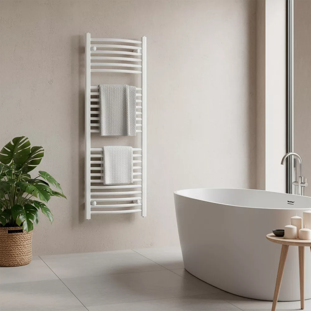 Wybierz zakrzywiony grzejnik do suszenia ręczników Leziter 1200x500 mm biały i doświadcz idealnego połączenia stylu, wydajności i komfortu każdego dnia!