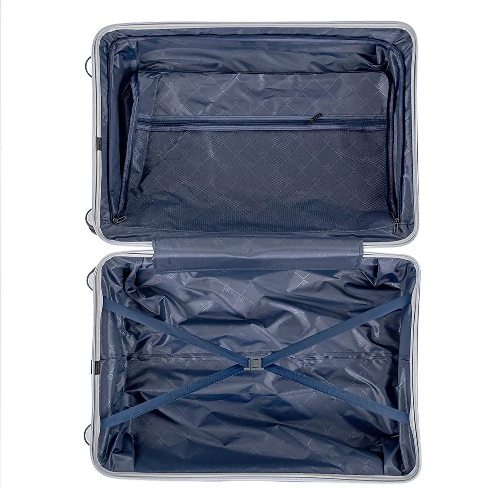 - Wnętrze: Przegroda zapinana na zamek błyskawiczny, elastyczny pasek mocujący we wszystkich trzech walizkach