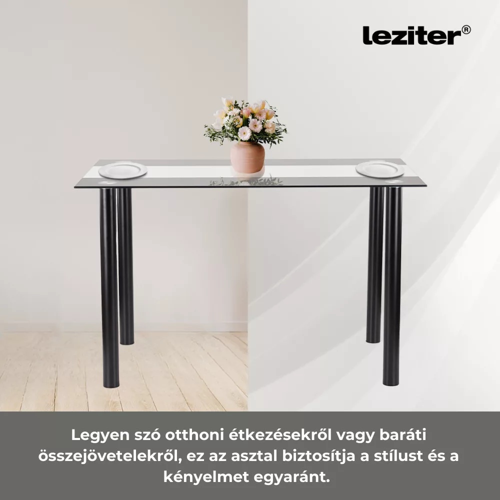 A Leziter Riona étkezőasztal letisztult dizájnja és fekete színvilága időtálló megjelenést biztosít, amely bármilyen modern vagy klasszikus enteriőrrel könnyedén harmonizál. A masszív szerkezet akár 60 kg teherbírásra is alkalmas, így biztonságosan használható mindennapi étkezésekhez és vendégfogadásokhoz egyaránt.