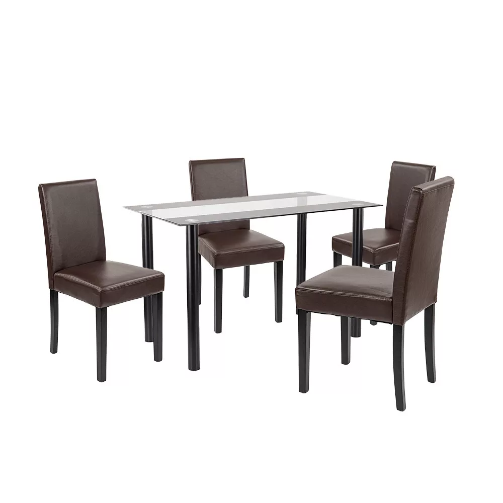 Zestaw zawiera również cztery krzesła Leziter Kelly z brązową tapicerką ze skóry ECO. Oprócz eleganckiego wyglądu, krzesła te są niezwykle łatwe w czyszczeniu. Piankowa powierzchnia siedziska o grubości 4 cm zapewnia komfort nawet podczas dłuższych posiłków, a solidne sosnowe nogi o nośności 120 kg gwarantują długotrwałą niezawodność.