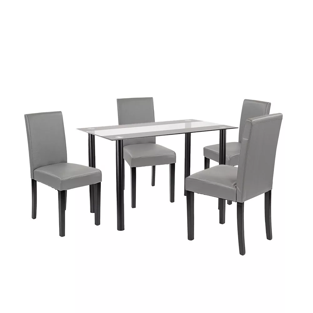 Zestaw zawiera również cztery krzesła Leziter Kelly w szarej tapicerce ze skóry ECO. Oprócz eleganckiego wyglądu, krzesła te są niezwykle łatwe w czyszczeniu. Piankowa powierzchnia siedziska o grubości 4 cm zapewnia komfort nawet podczas dłuższych posiłków, a solidne sosnowe nogi o nośności 120 kg gwarantują długotrwałą niezawodność.