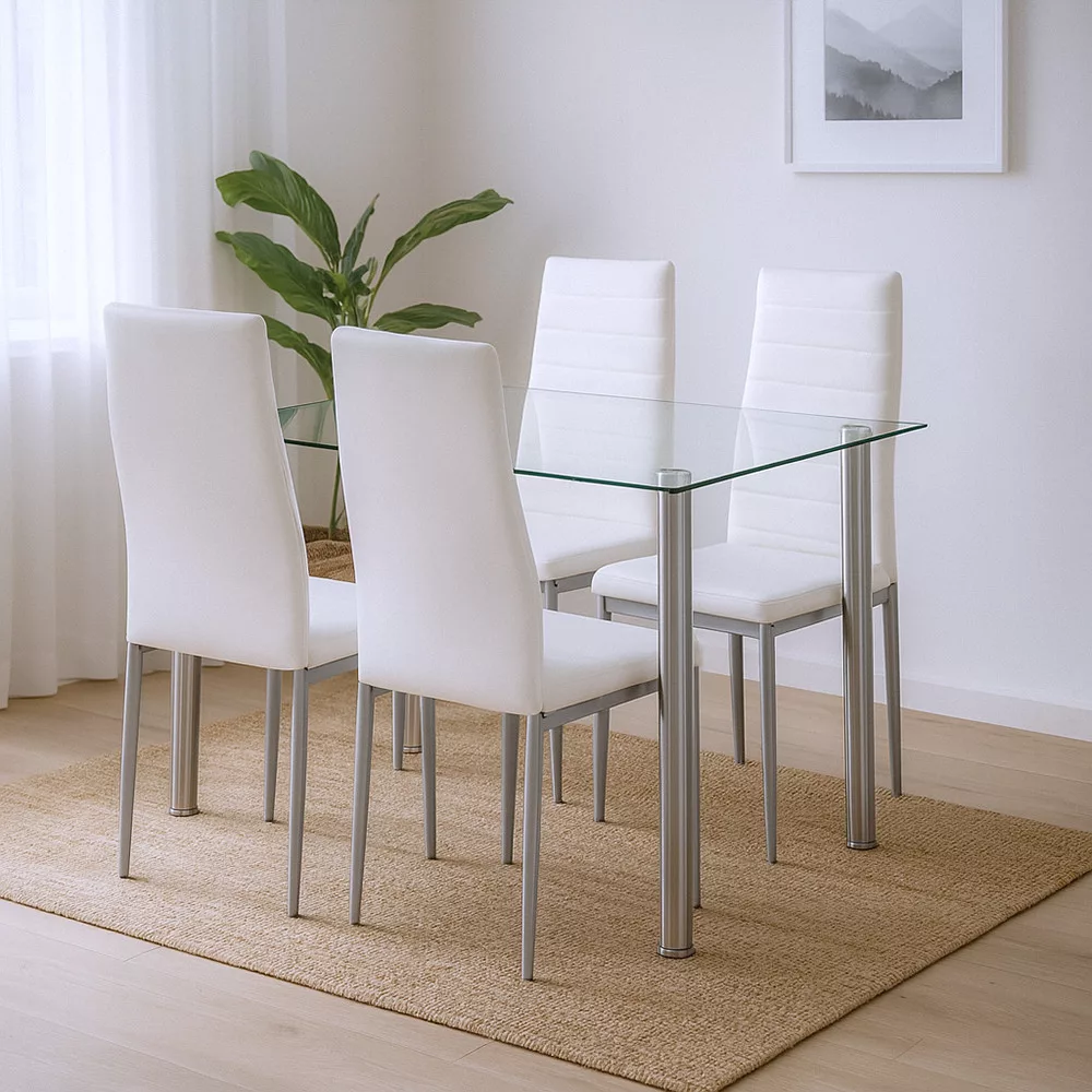 Centralnym elementem zestawu jadalnianego Mateo jestszklany stółBerna 120 cm firmy Leziter, jeden z najpopularniejszych elementów w nowoczesnych wnętrzach. Blat zhartowanego szkła o grubości 8mm zapewnia nie tylko elegancki wygląd, ale jest również wysoce odporny na zarysowania i uderzenia. Szklana powierzchnia jest łatwa w czyszczeniu, dzięki czemu zachowuje lśniący, czysty wygląd nawet podczas codziennego użytkowania.