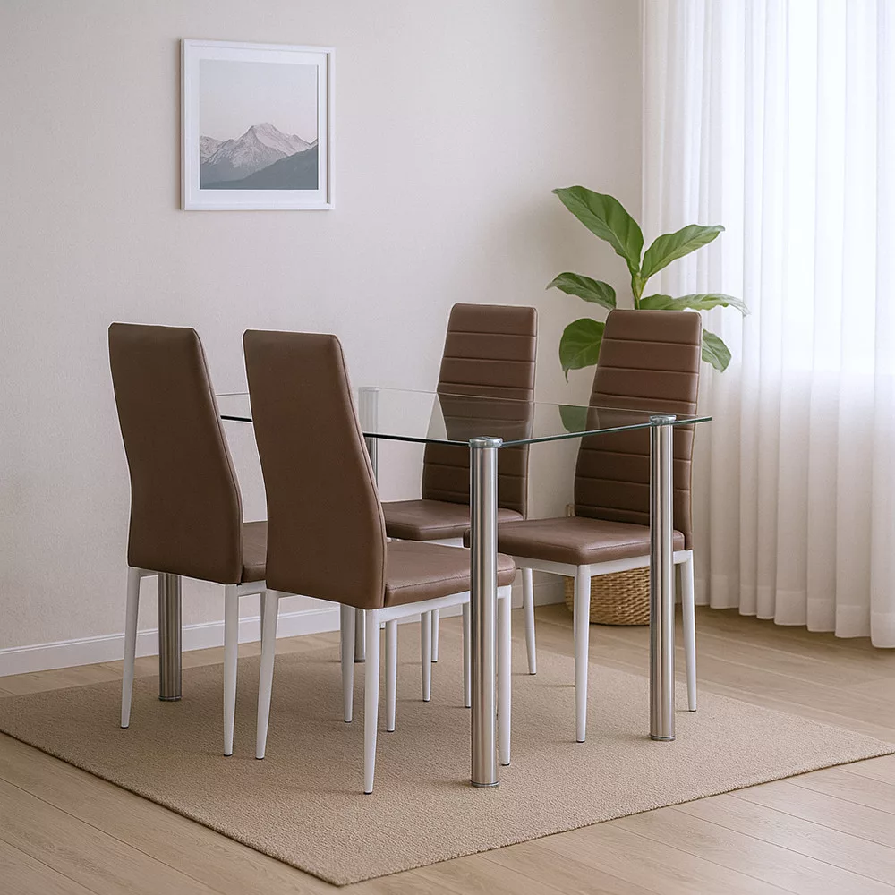 Zestaw jadalniany Nolen 4+1 - nowoczesna elegancja z brązowymi krzesłami i stołem z hartowanego szkła