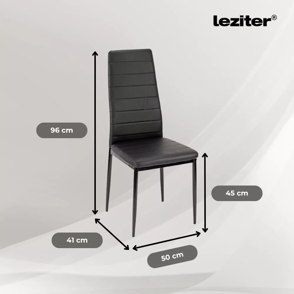 Krzesła do jadalni Tino NOVA, które wchodzą w skład zestawu, mają charakterystyczny wygląd, który doskonale komponuje się z nowoczesnymi liniami stołu Riona. Czarne siedzisko ze skóry tekstylnej jest eleganckie, a jednocześnie łatwe w obsłudze, a metalowa rama zapewnia długotrwałą stabilność i bezpieczeństwo w codziennym użytkowaniu.