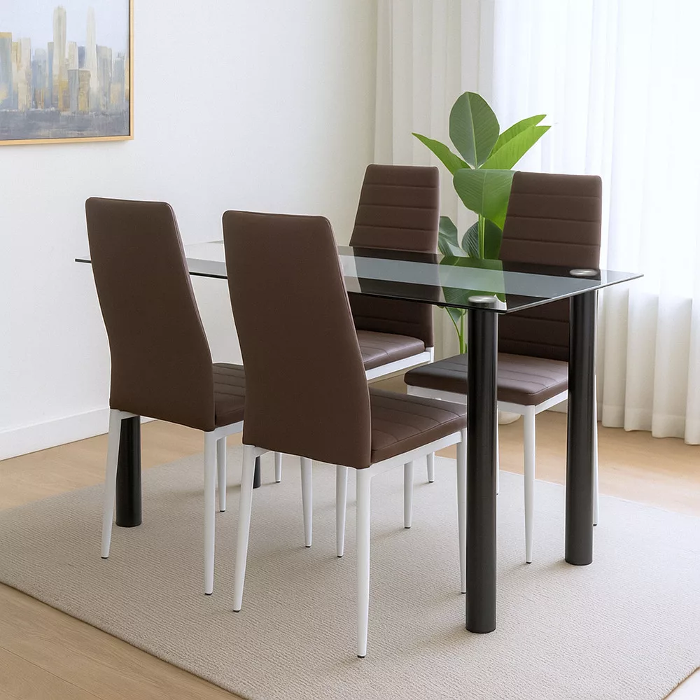Krzesła do jadalni Tino NOVA, które wchodzą w skład zestawu, mają charakterystyczny wygląd, który doskonale komponuje się z nowoczesnymi liniami stołu Riona. Brązowa powierzchnia siedziska ze skóry tekstylnej jest elegancka, a jednocześnie łatwa w obsłudze, a biała metalowa rama zapewnia długotrwałą stabilność i bezpieczeństwo w codziennym użytkowaniu.