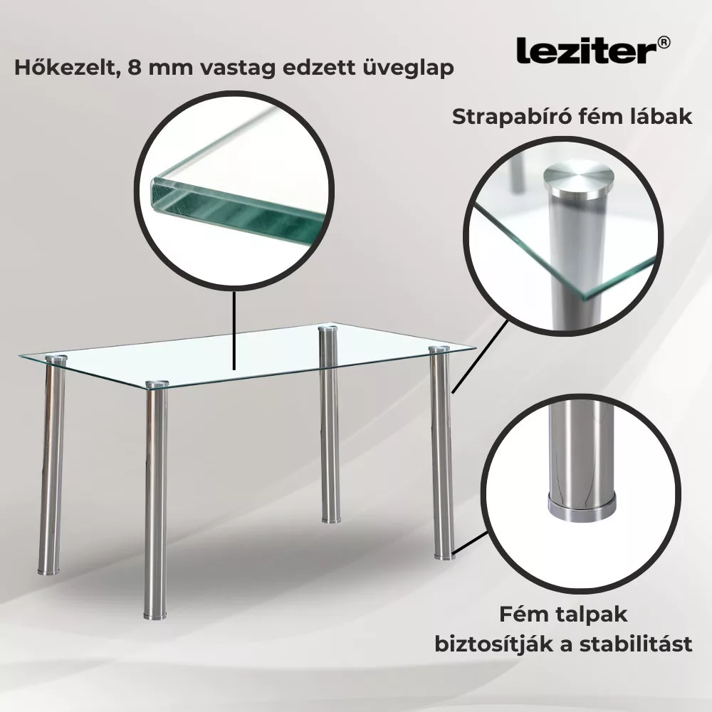 Berna 140 cm szögletes üveg étkezőasztalElegáns, letisztult és strapabíró – itt az idő, hogy új szintre emeld az étkeződ!Sok étkezőasztal idővel instabillá válik, vagy nehezen illeszkedik a modern belső terekbe. A Leziter Berna 140 cm üveg étkezőasztal letisztult, minimalista kialakításával és masszív fém lábaival hosszú távon biztosít stabilitást és eleganciát.Strapabíró és biztonságos hőkezelt üvegAz asztallap 8 mm vastag edzett üvegből készült, amely ellenáll a kisebb ütődéseknek és karcolásoknak. A hőkezelési eljárásnak köszönhetően nagyobb biztonságot és hosszabb élettartamot biztosít, mint a hagyományos üvegfelületek.Stabil fém lábak és padlóvédelemA rozsdamentes fém lábak nemcsak tartósak, hanem elegáns megjelenést is kölcsönöznek az asztalnak. Az alján található műanyag gyűrűk védik a padlót a karcolásoktól és a kopástól, így bátran használható bármilyen burkolaton.Ideális méret és letisztult designA 140 cm hosszúság, 80 cm szélesség és 75 cm magasság elegendő helyet biztosít akár 4-6 fő számára is, így tökéletes választás családi vacsorákhoz vagy baráti összejövetelekhez. Modern megjelenése miatt bármilyen lakberendezési stílushoz illeszkedik.A Leziter Berna üveg étkezőasztal egyesíti az esztétikát és a funkcionalitást, miközben masszív szerkezete hosszú távon megbízható társ marad az otthonban.