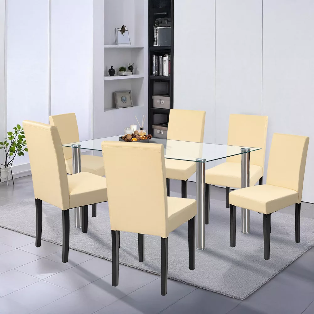 Zestaw zawiera również sześć krzeseł Leziter Kelly w beżowej tapicerce ze skóry ECO. Oprócz eleganckiego wyglądu, krzesła te są niezwykle łatwe w czyszczeniu. Piankowa powierzchnia siedziska o grubości 4 cm zapewnia komfort nawet podczas dłuższych posiłków, a solidne sosnowe nogi o nośności 120 kg gwarantują długotrwałą niezawodność.