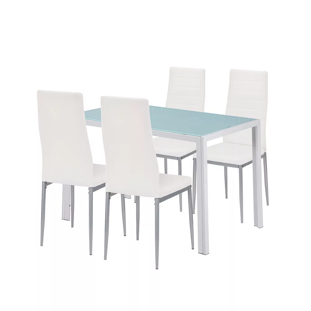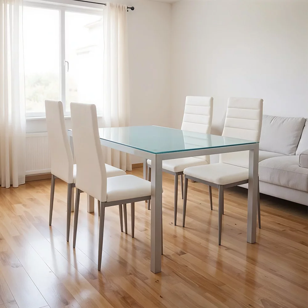 Elegancki wygląd krzeseł ze skóry tekstylnej i miękkie poduszki zapewniają przyjemne wrażenia podczas siedzenia, a szklany blat stołu tworzy przewiewny, nowoczesny efekt w przestrzeni. Wytrzymałość gwarantuje solidna metalowa rama i odporny na zarysowania szklany blat.