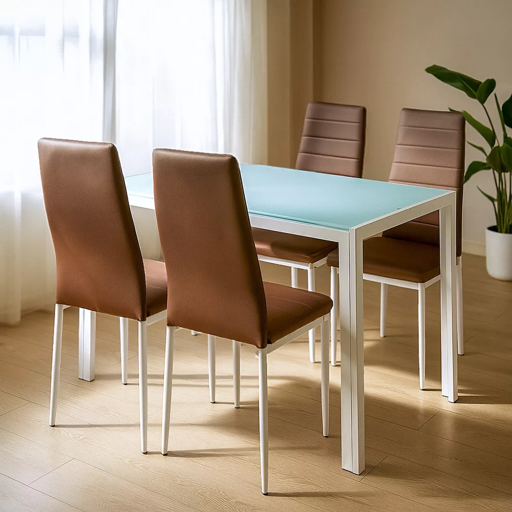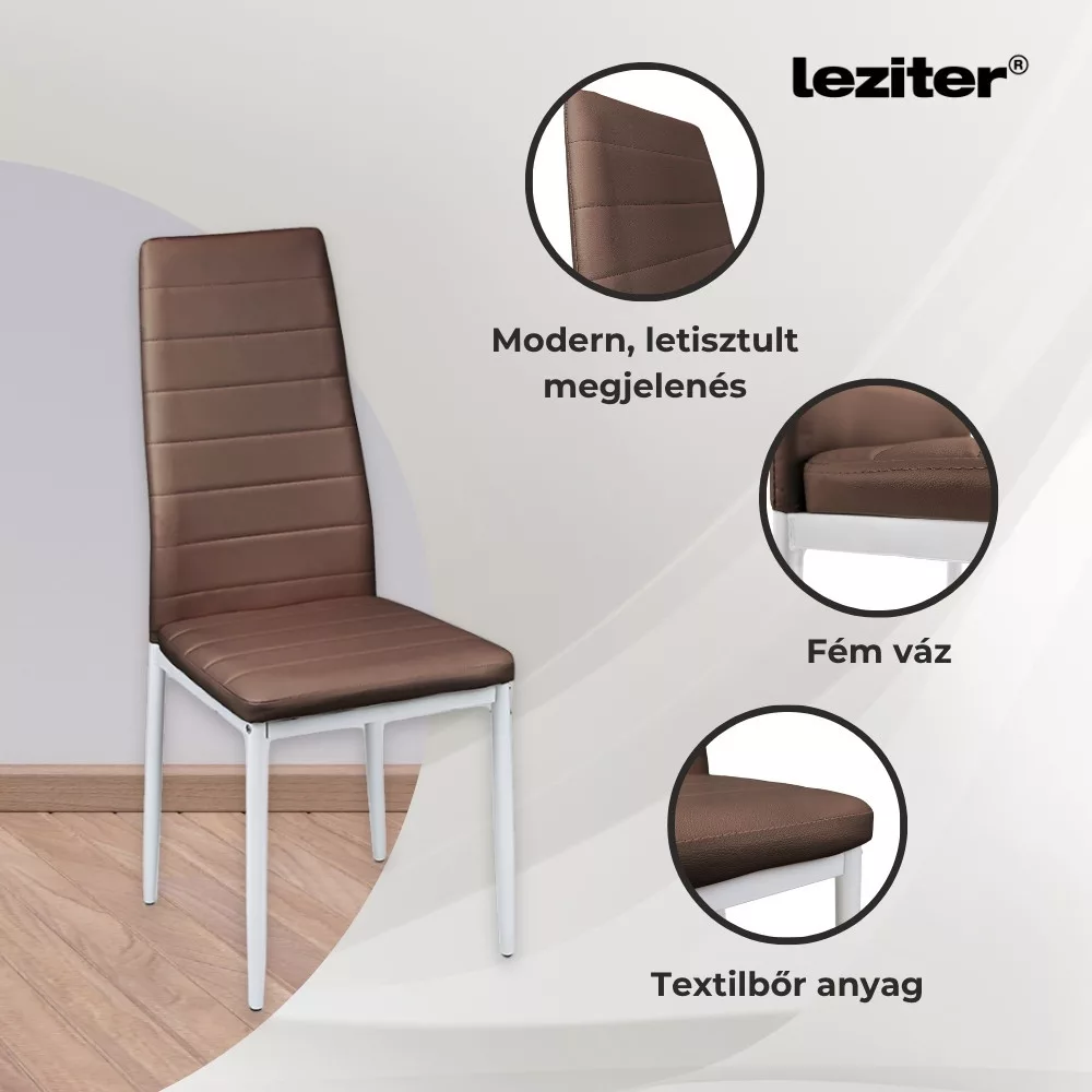 Krzesła Tino Nova w tym zestawie mają brązową tapicerkę ze skóry tekstylnej i białe metalowe nogi - klasyczny odcień, który świetnie wygląda w każdym wnętrzu, zapewniając prawdziwie elegancki wygląd. Komfort jest kluczową cechą projektu, z ergonomicznym oparciem i idealną wysokością siedziska 45 cm dla dłuższych sesji siedzących.