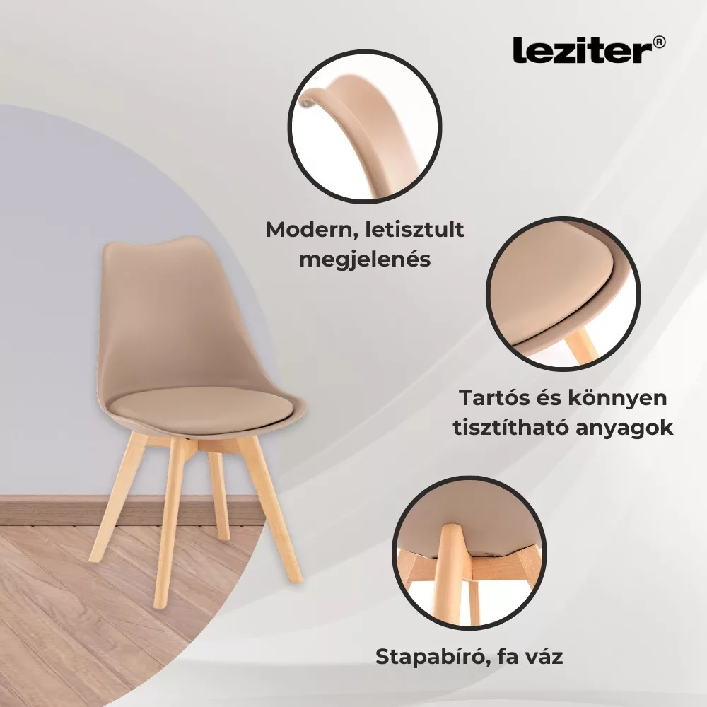 Beżowe krzesła Silla w tym zestawie tworzą jasną i przyjazną atmosferę. Ich ergonomiczna konstrukcja i tapicerka z efektem skóry syntetycznej zapewniają dodatkowy komfort, a nogi w kolorze drewna bukowego zapewniają naturalny wygląd i stabilność.