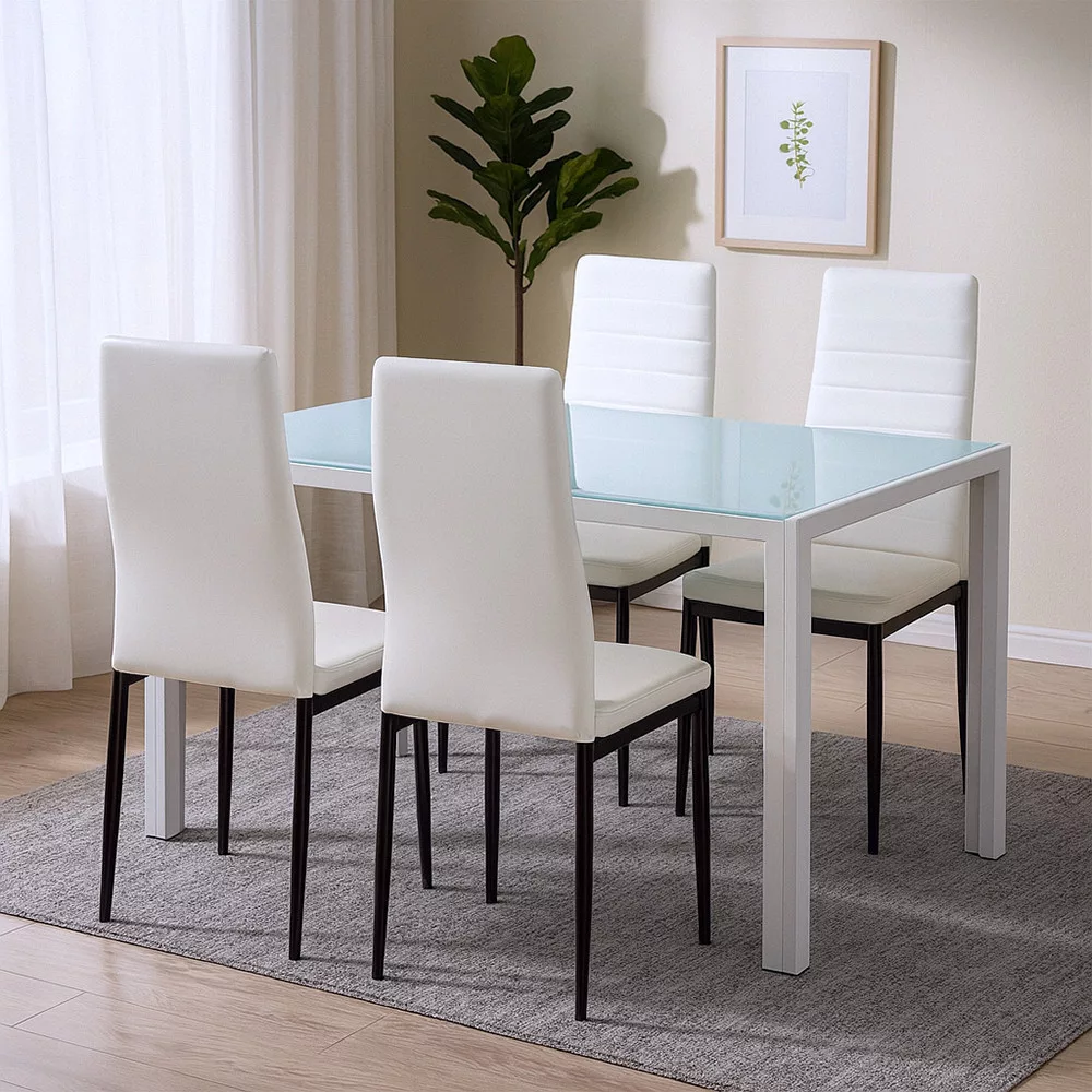 Zestawdo jadalni Mabel4+1 to idealny wybór, jeśli chcesz połączyć styl, wygodę i praktyczność. Stół o czystych liniach wykonany jest z hartowanego, poddanego obróbce cieplnej, odpornego na uderzenia szklanego blatu i malowanych proszkowo na biało metalowych nóg - połączenie, które zarówno rozświetla przestrzeń, jak i zapewnia stabilność w codziennym użytkowaniu. Dzięki wymiarom 140 × 80 cm stół idealnie sprawdzi się w mniejszych kuchniach i jadalniach, zapewniając jednocześnie komfortowe spożywanie posiłków nawet 4-6 osobom .