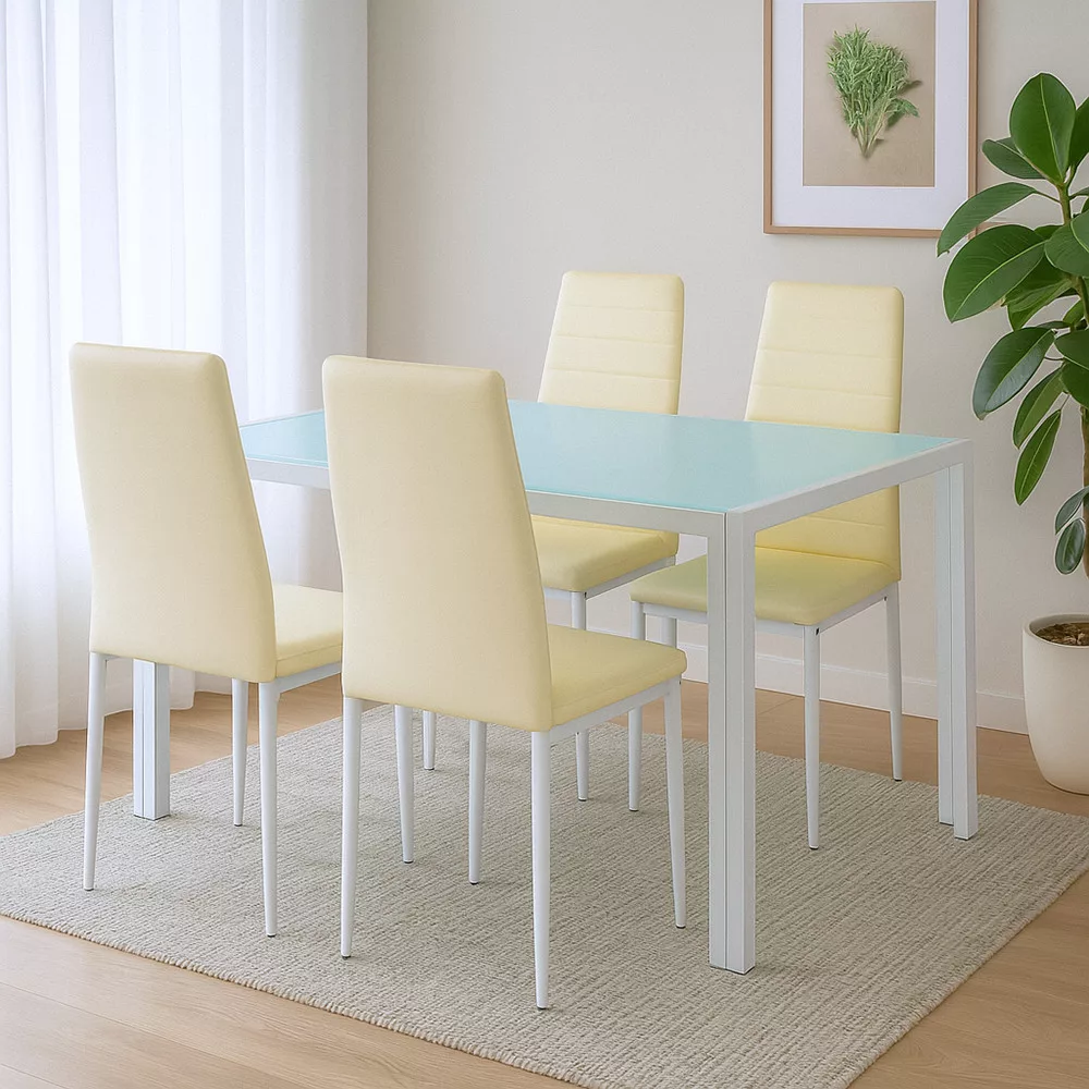 Szklane powierzchnie sprawiają, że przestrzeń wydaje się bardziej przestronna, a solidne metalowe konstrukcje zapewniają długotrwałą stabilność mebli. Połączenie 4 wygodnych krzeseł i przestronnego stołu to idealny wybór na rodzinne obiady, spotkania z przyjaciółmi, a nawet codzienne posiłki.
