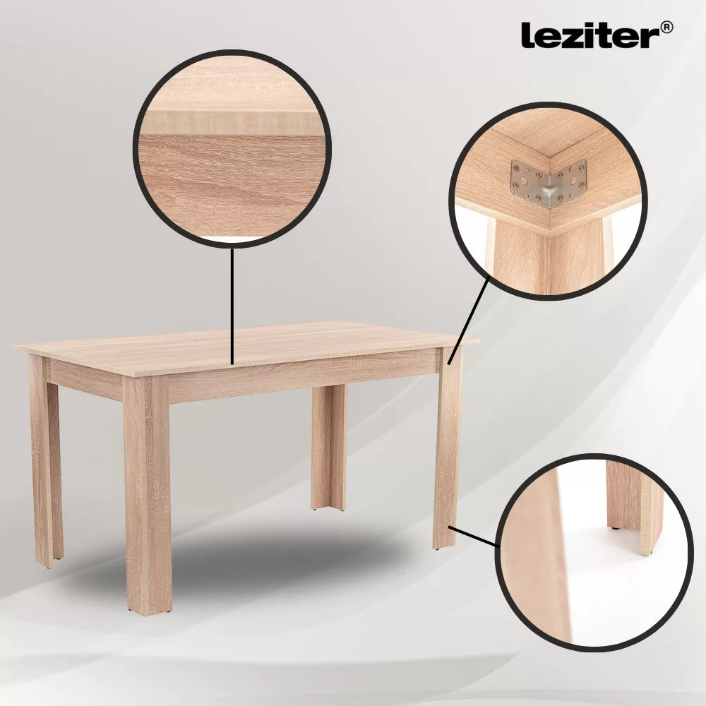 4-osobowy zestaw jadalniany Leziter Leon ma wszystko, czego można oczekiwać od nowoczesnego, niezawodnego mebla. Stół wykonany jest z wytrzymałej płyty meblowej w kolorze dąb sonoma i ma wymiary 140x80x76 cm, dzięki czemu idealnie nadaje się do średnich pomieszczeń, zapewniając jednocześnie wygodną przestrzeń do wspólnego spożywania posiłków. Konstrukcja montowana do blatu pozwala na szybki i łatwy montaż, a metalowe wzmocnienia narożników gwarantują stabilność i długą żywotność.