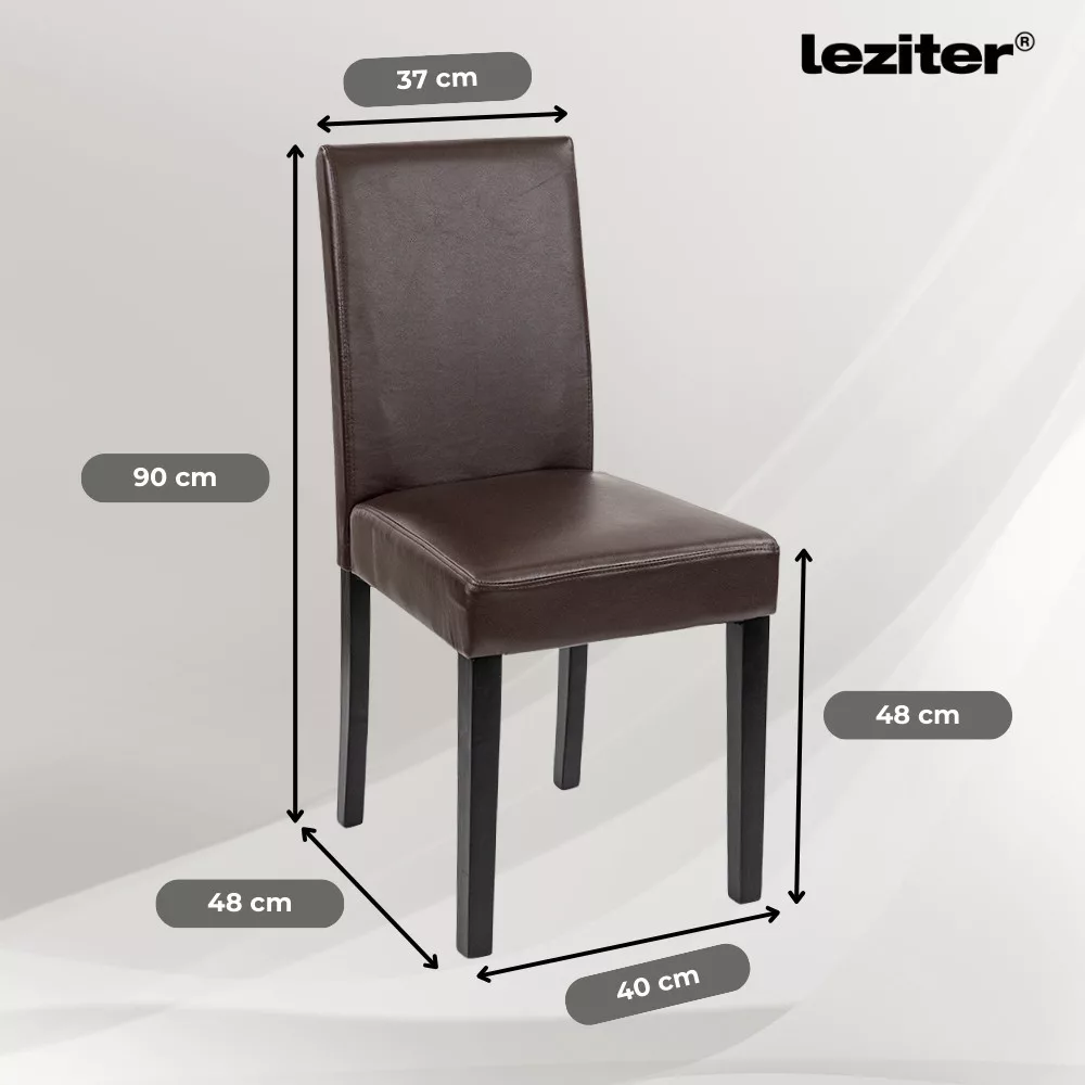 Zestaw zawiera cztery krzesła Leziter Kelly, które są nie tylko stylowe dzięki brązowej tapicerce ze skóry ECO, ale także niezwykle łatwe w czyszczeniu. Gruba piankowa powierzchnia siedziska o grubości 4 cm zapewnia komfort nawet podczas długich kolacji, a solidne sosnowe nogi o nośności 120 kg pozostają niezawodnymi towarzyszami nawet podczas intensywnego użytkowania.