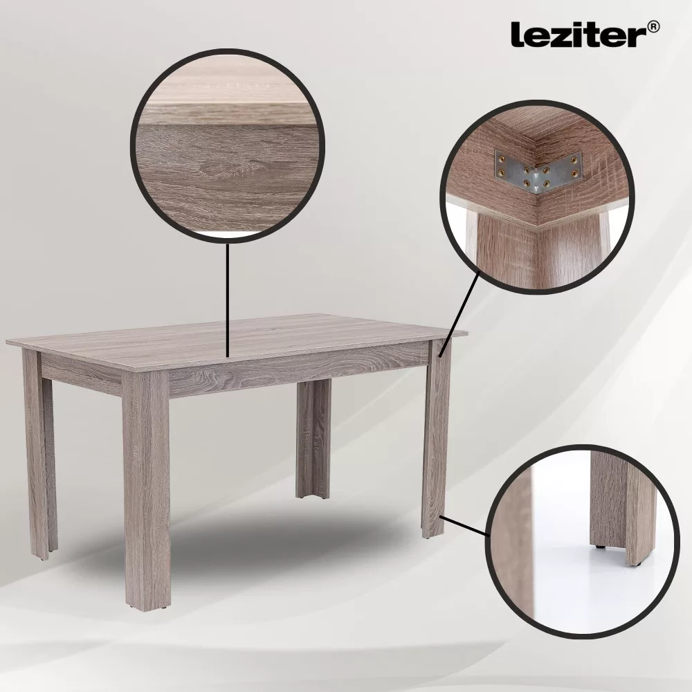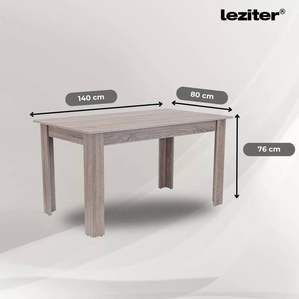 4-osobowy zestaw jadalniany Leziter Leon ma wszystko, czego można oczekiwać od nowoczesnego, niezawodnego mebla. Stół wykonany jest z wytrzymałej płyty meblowej dąb York i ma wymiary 140x80x76 cm, dzięki czemu idealnie nadaje się do średnich pomieszczeń, zapewniając jednocześnie wygodną przestrzeń do wspólnego spożywania posiłków. Panelowa konstrukcja pozwala na szybki i łatwy montaż, a metalowe wzmocnienia narożników gwarantują stabilność i długą żywotność.