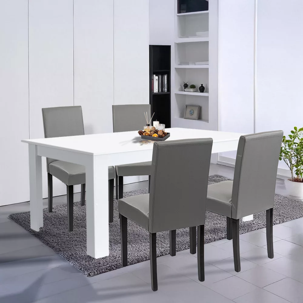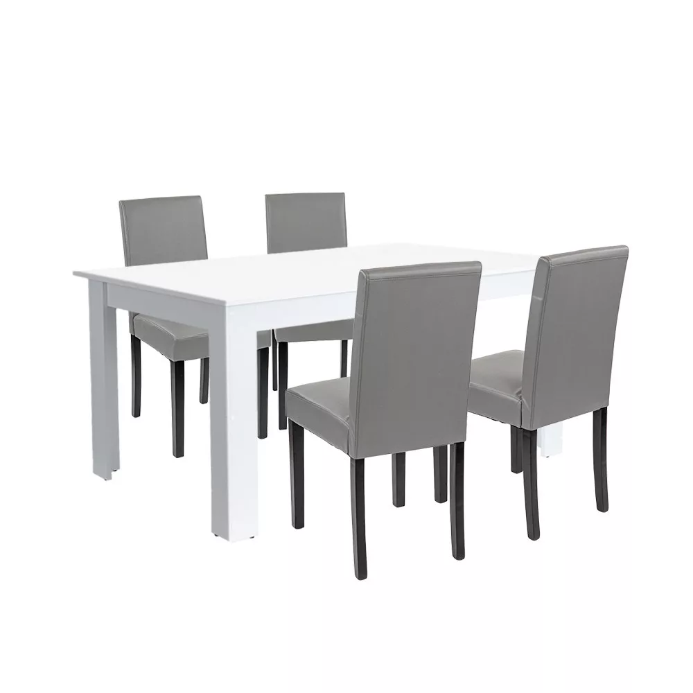 Masz dość chwiejących się stołów i niewygodnych, skrzypiących krzeseł, które psują atmosferę posiłków? Podczas codziennych obiadów, uroczystości rodzinnych czy spotkań z przyjaciółmi każdy szuka komfortu i przyjemnej atmosfery - ale niestabilny stół lub trudne do czyszczenia powierzchnie są po prostu uciążliwe. Zwłaszcza jeśli mieszkasz z małymi dziećmi lub częstymi gośćmi, może to być źródłem ciągłego stresu. Zestaw jadalniany Leziter Leon 4+1 w kolorze biało-szarym rozwiązuje ten problem raz na zawsze: praktyczny, ale elegancki zestaw w praktycznym rozmiarze, oferujący cztery wygodne krzesła i solidny, praktyczny stół jadalniany - idealny do domu, biura lub gastronomii.