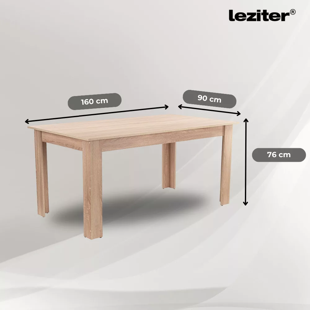 4-osobowy zestaw jadalniany Leziter Leon ma wszystko, czego można oczekiwać od nowoczesnego, niezawodnego mebla. Stół wykonany jest z wytrzymałej płyty meblowej w kolorze dąb sonoma i ma wymiary 160x90x76 cm, dzięki czemu może pełnić funkcję bardziej akcentującego mebla w średniej wielkości jadalniach, a w bardziej przestronnych pomieszczeniach może służyć jako elegancki i wygodny stół centralny. Idealny dla 6-8 osób, jest doskonałym wyborem na rodzinne obiady lub spotkania z przyjaciółmi. Konstrukcja z blatem pozwala na szybki i łatwy montaż, a metalowe wzmocnienia narożników gwarantują stabilność i długą żywotność.