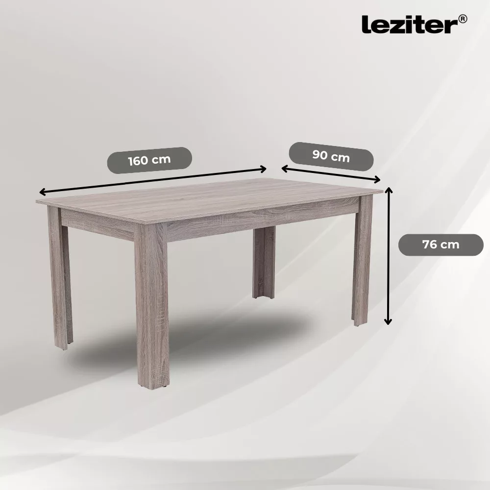 4-osobowy zestaw jadalniany Leziter Leon ma wszystko, czego można oczekiwać od nowoczesnego, niezawodnego mebla. Stół wykonany jest z wytrzymałej płyty meblowej dąb York i ma wymiary 160x90x76 cm, dzięki czemu może pełnić funkcję bardziej akcentującego mebla w średniej wielkości jadalniach, a w bardziej przestronnych przestrzeniach może służyć jako elegancki i wygodny stół centralny. Zapewnia idealną przestrzeń dla 6-8 osób, co czyni go doskonałym wyborem na rodzinne obiady lub spotkania z przyjaciółmi. Konstrukcja z blatem pozwala na szybki i łatwy montaż, a metalowe wzmocnienia narożników gwarantują stabilność i długą żywotność.