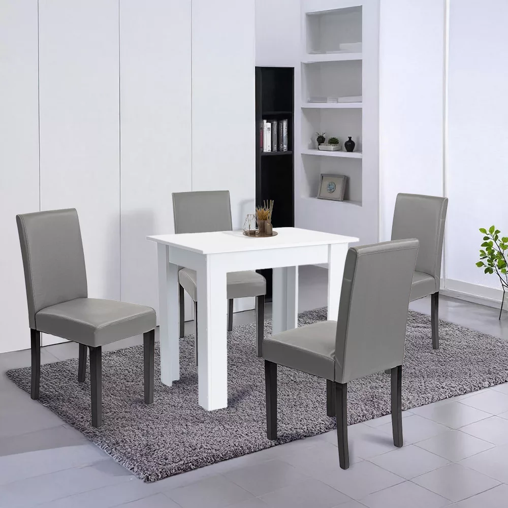 4-osobowy zestaw jadalniany Leziter Leon ma wszystko, czego można oczekiwać od nowoczesnego, niezawodnego mebla. Stół wykonany jest z wytrzymałej białej płyty meblowej i ma wymiary 86x60x76 cm, dzięki czemu idealnie nadaje się do mniejszych przestrzeni, zapewniając jednocześnie wygodną przestrzeń do wspólnego spożywania posiłków. Konstrukcja montowana do blatu pozwala na szybki i łatwy montaż, a metalowe wzmocnienia narożników gwarantują stabilność i długą żywotność.