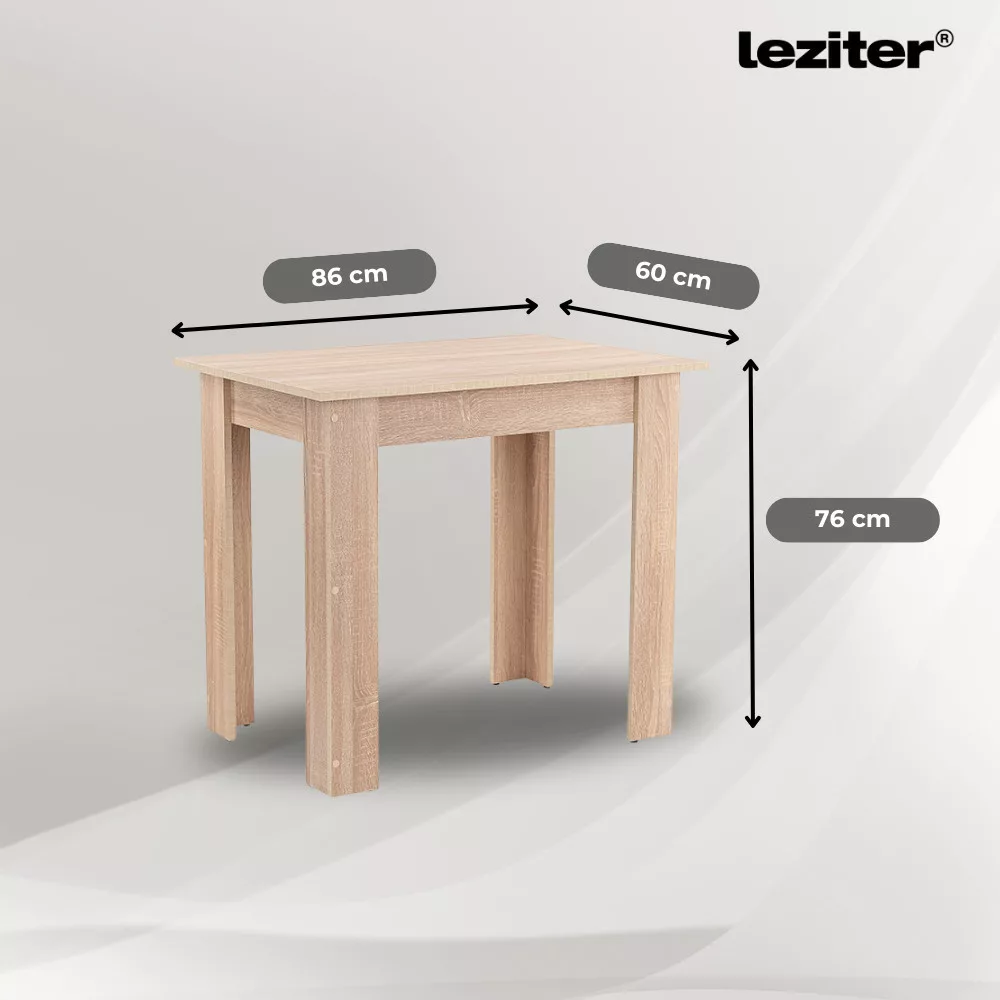 4-osobowy zestaw jadalniany Leziter Leon ma wszystko, czego można oczekiwać od nowoczesnego, niezawodnego mebla. Stół wykonany jest z wytrzymałej płyty meblowej w kolorze dąb sonoma i ma wymiary 86x60x76 cm, dzięki czemu idealnie nadaje się do mniejszych przestrzeni, zapewniając jednocześnie wygodną przestrzeń do wspólnego spożywania posiłków. Panelowa konstrukcja pozwala na szybki i łatwy montaż, a metalowe wzmocnienia narożników gwarantują stabilność i długą żywotność.