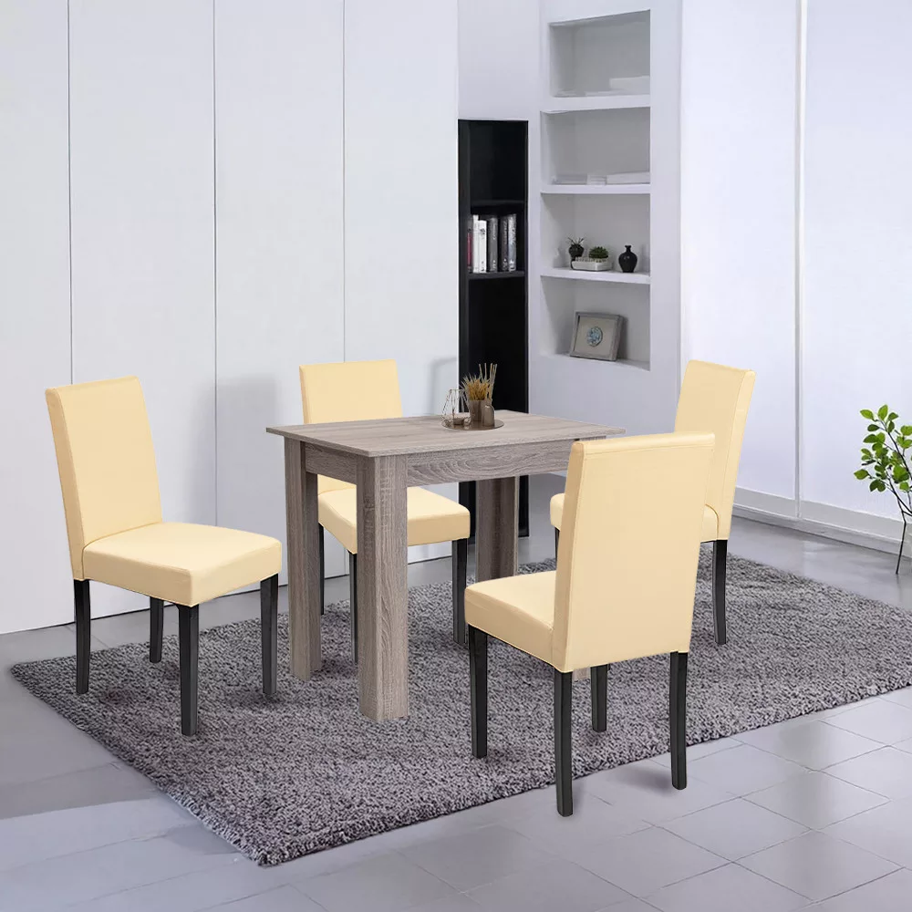 Zestaw zawiera cztery krzesła Leziter Kelly, które są nie tylko stylowe dzięki beżowej tapicerce ze skóry ekologicznej, ale także niezwykle łatwe w czyszczeniu. Gruba, 4-centymetrowa piankowa powierzchnia siedziska zapewnia komfort nawet podczas długich kolacji, a solidne sosnowe nogi o nośności 120 kg pozostają niezawodnymi towarzyszami nawet podczas intensywnego użytkowania.