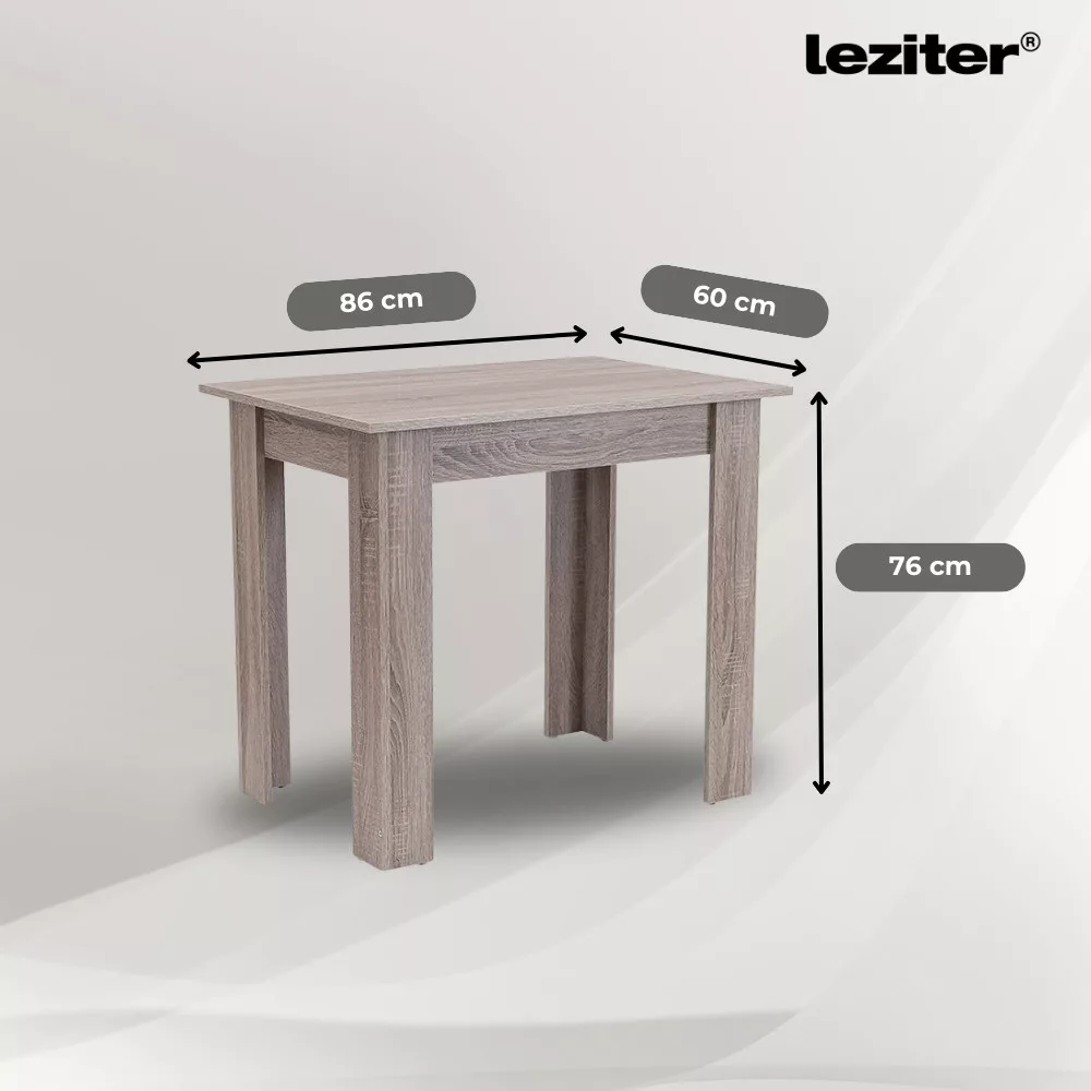 4-osobowy zestaw jadalniany Leziter Leon ma wszystko, czego można oczekiwać od nowoczesnego, niezawodnego mebla. Stół wykonany jest z wytrzymałej płyty meblowej z dębu York i ma wymiary 86x60x76 cm, dzięki czemu idealnie nadaje się do mniejszych przestrzeni, zapewniając jednocześnie wygodną przestrzeń do wspólnego spożywania posiłków. Konstrukcja montowana do blatu pozwala na szybki i łatwy montaż, a metalowe wzmocnienia narożników gwarantują stabilność i długą żywotność.